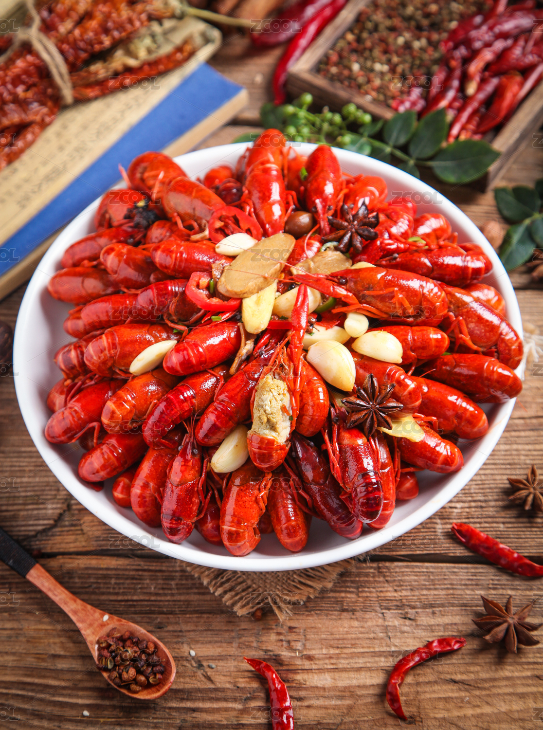 木桌上的清蒸蒜香小龙虾