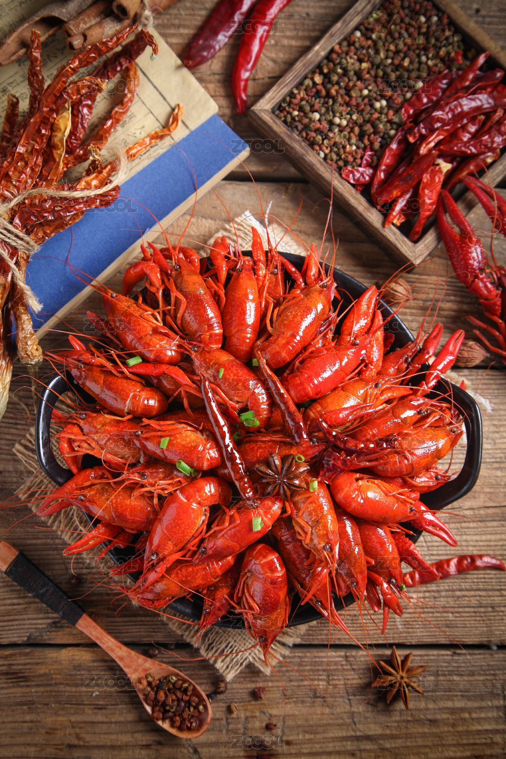 桌面上的麻辣藤椒虾