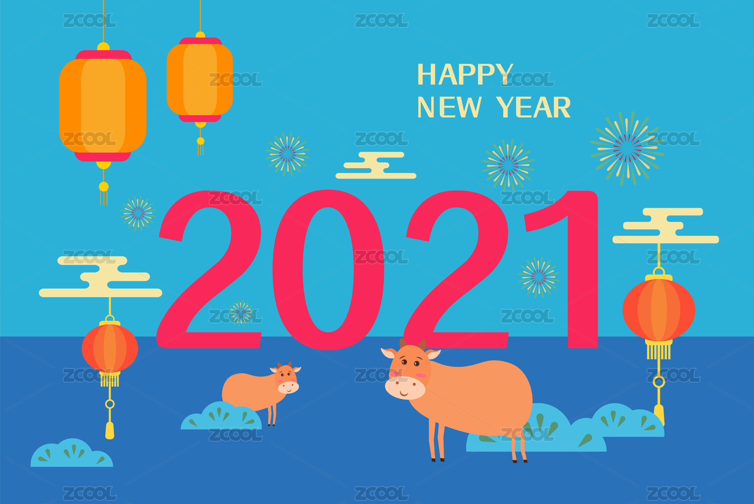 2021中国新年祝福,牛年大吉牛元素矢量