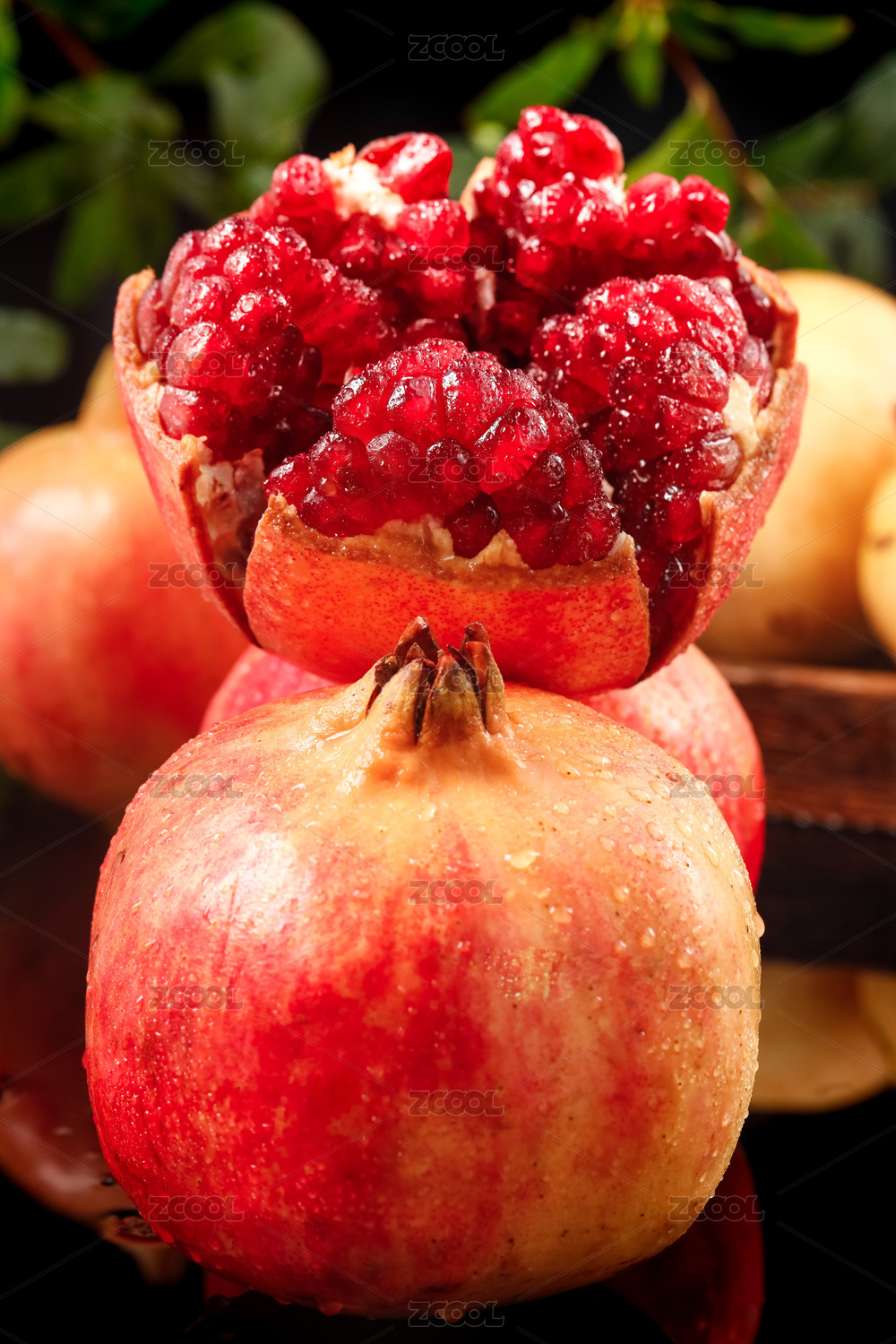 黑底上放着一个完整的石榴和一个掰开的石榴