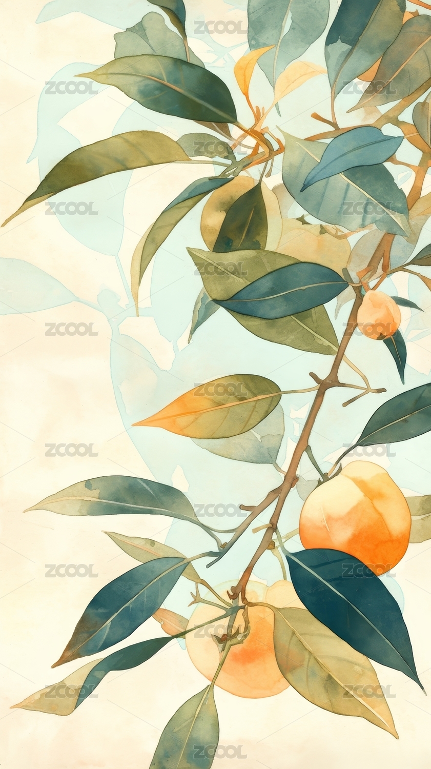 水彩画黄澄澄的桃子挂在枝头