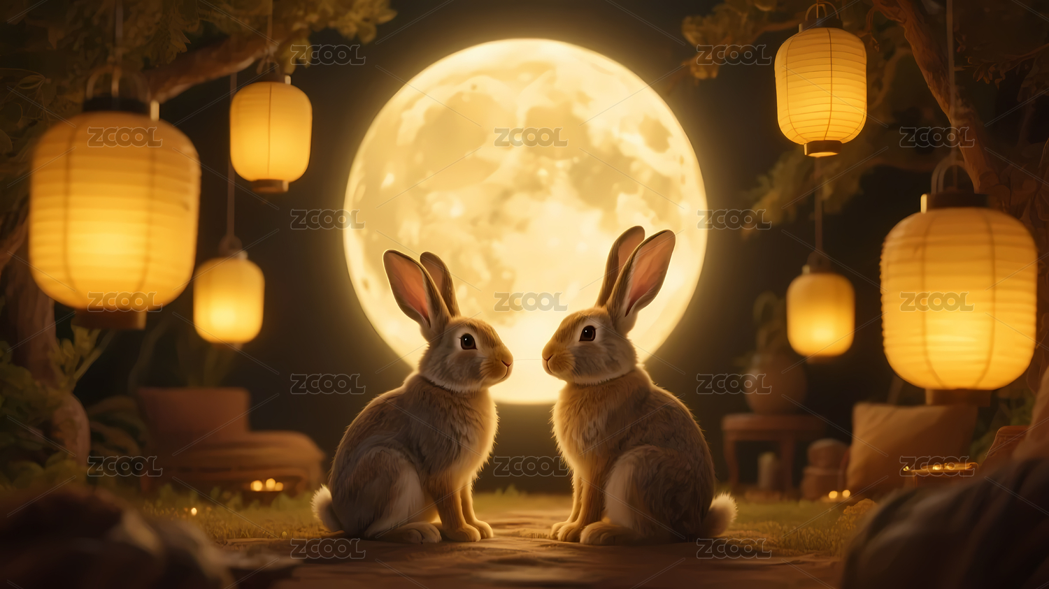 AIGC202403,中秋,玉兔,兔子,月亮,桂花,花灯,灯笼,月饼