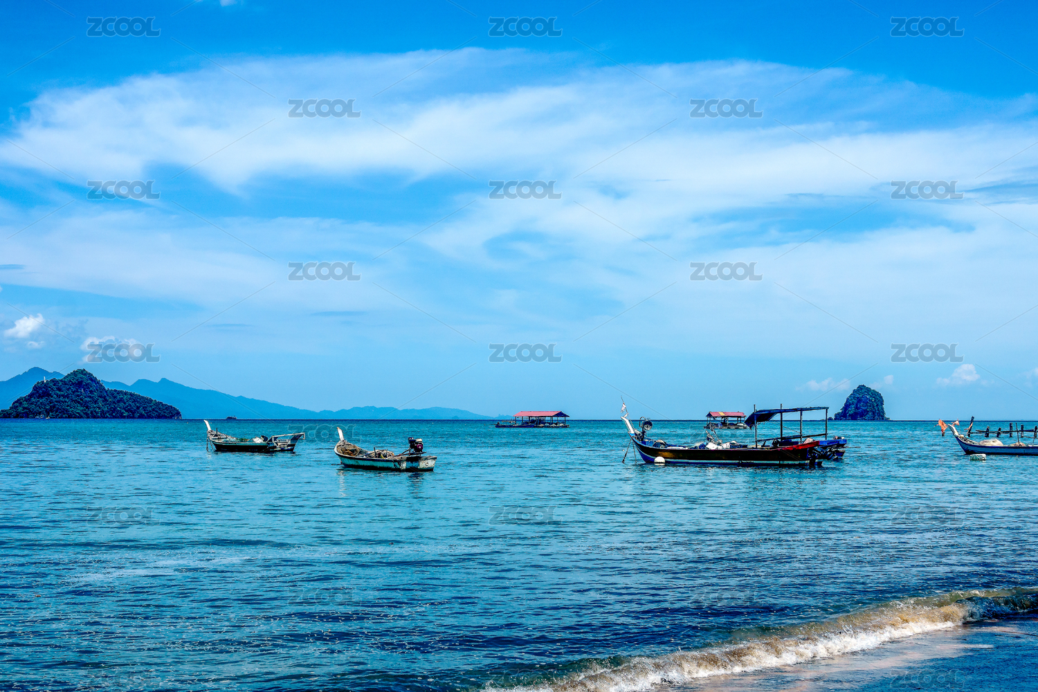 马来西亚兰卡威晴天黑沙海滩停泊的渔船