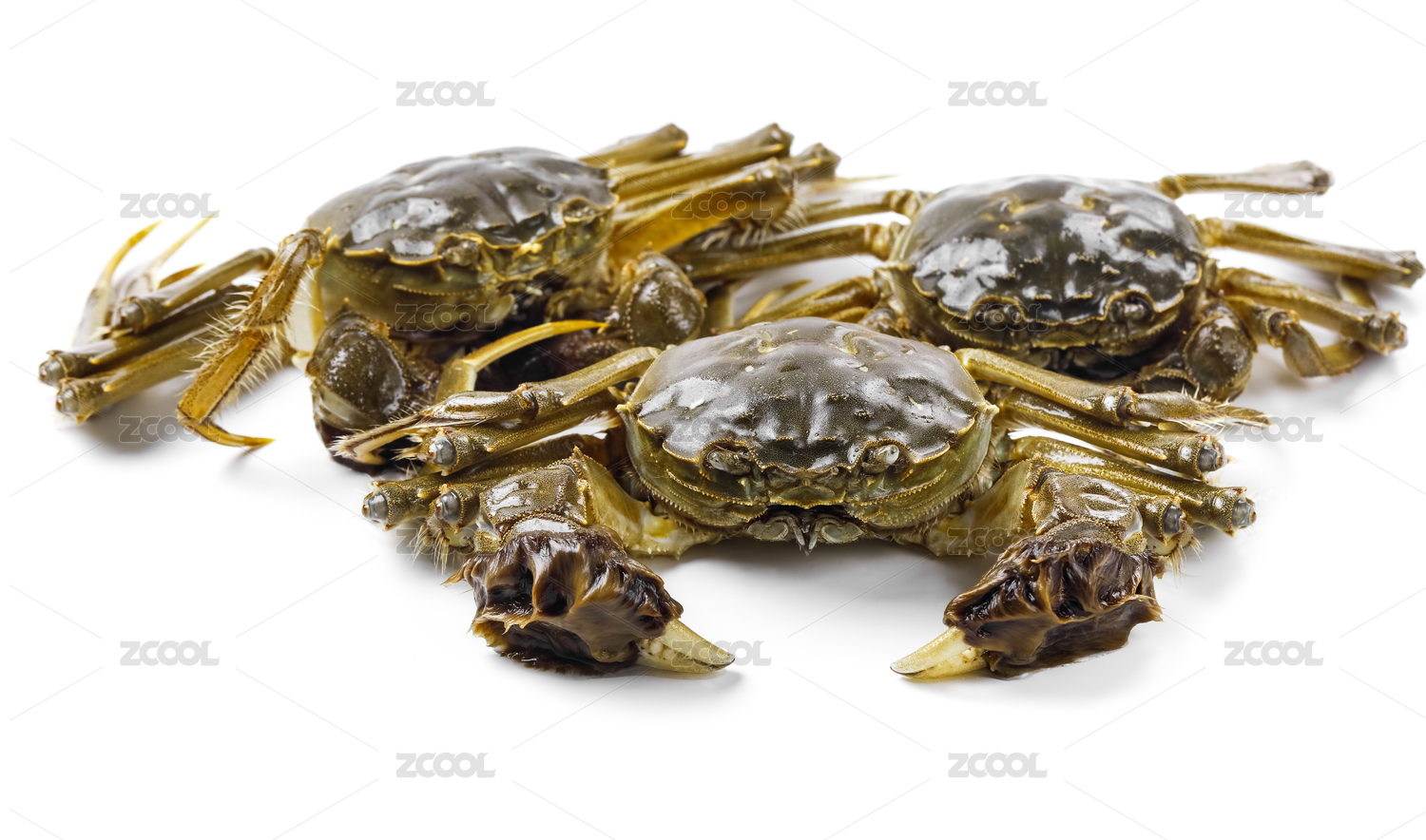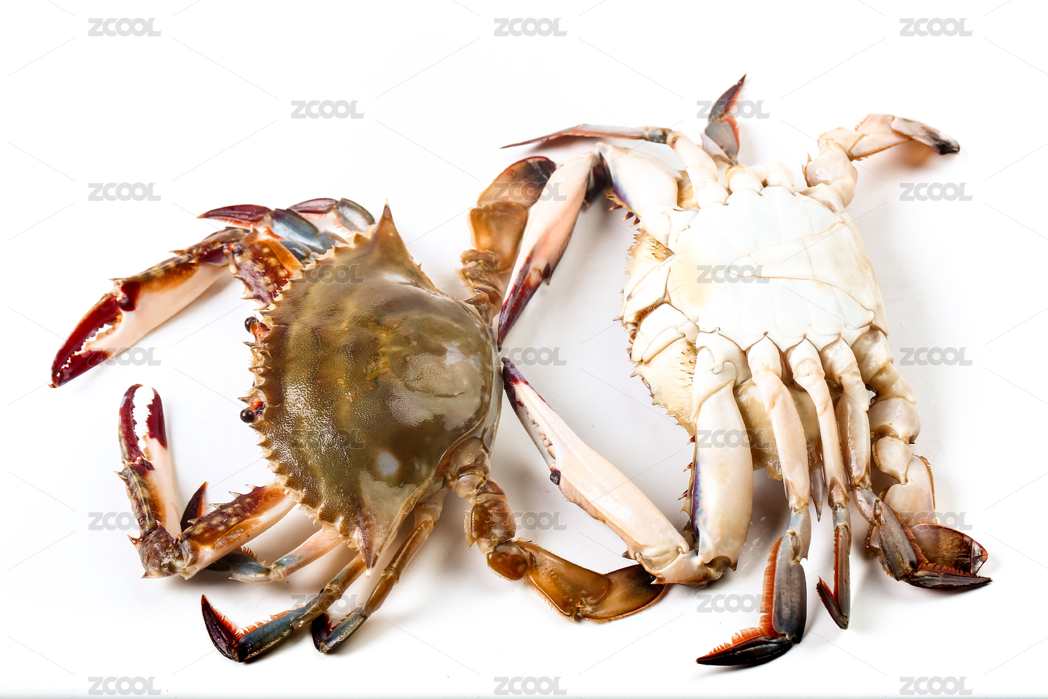 俯视白背景上两只正反摆放的生鲜大闸蟹