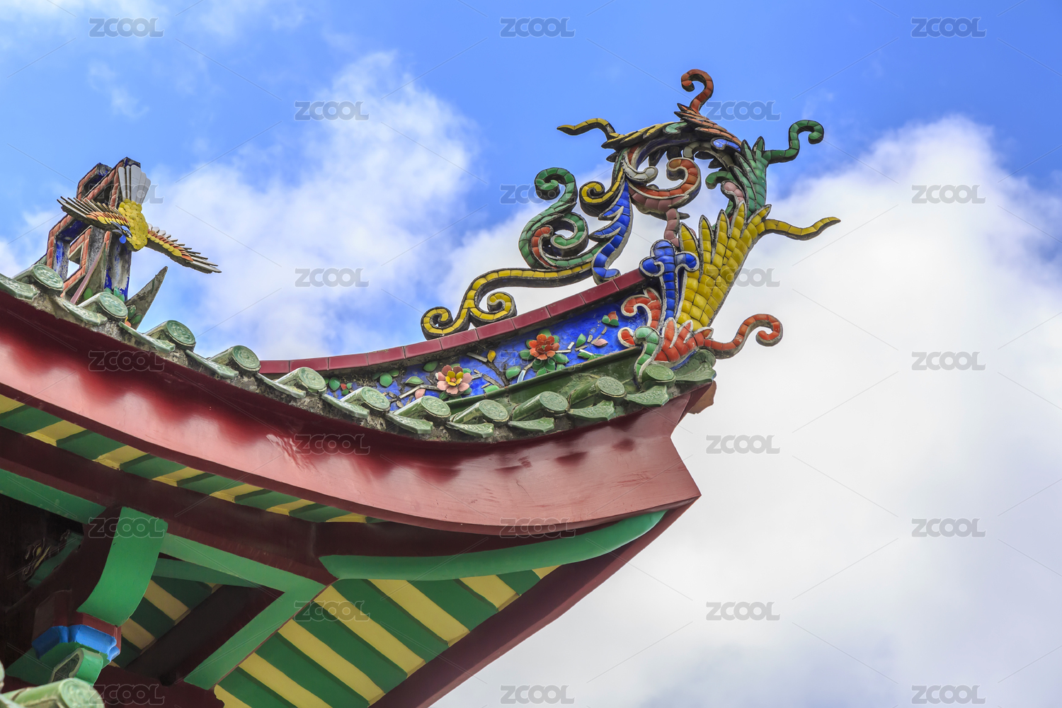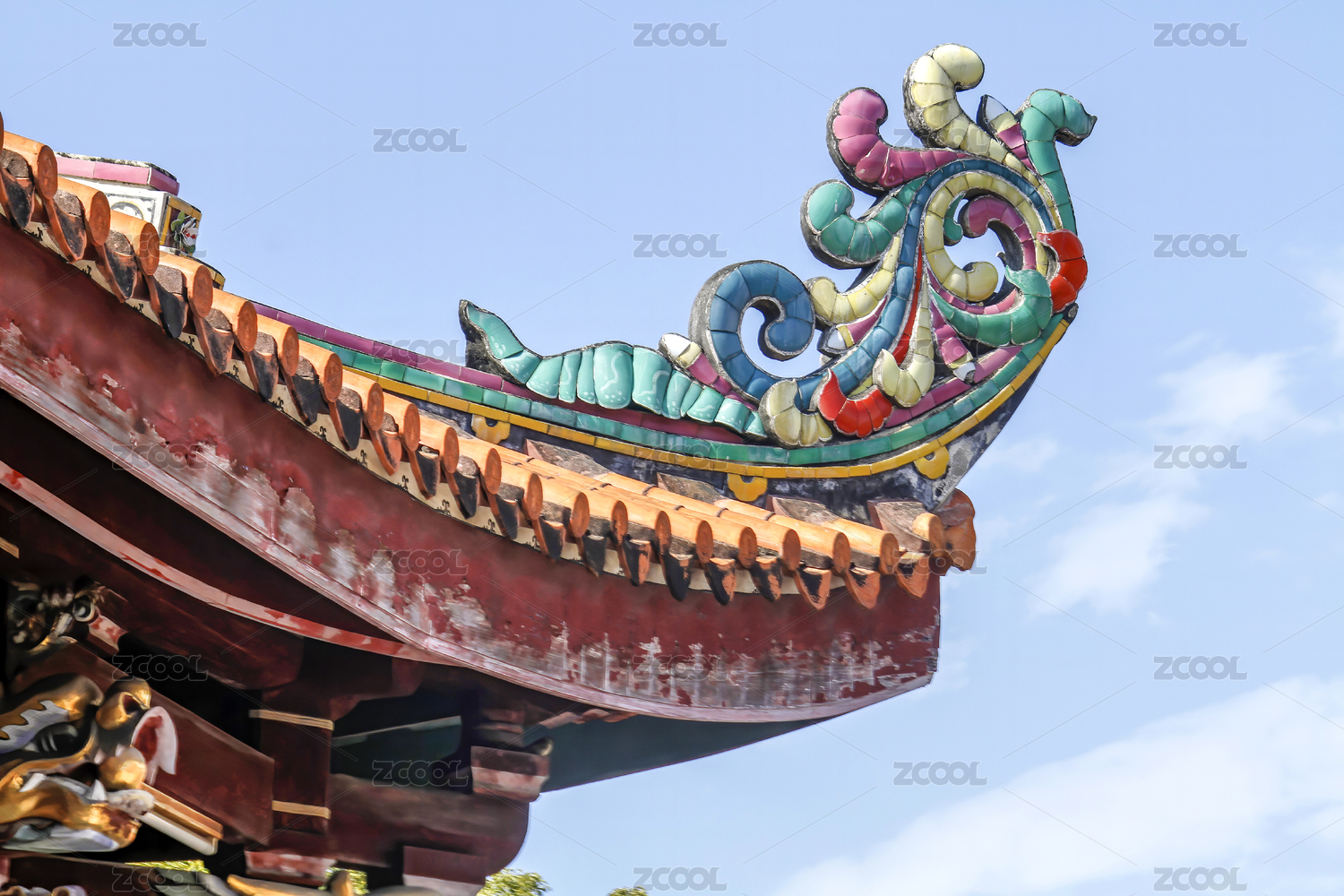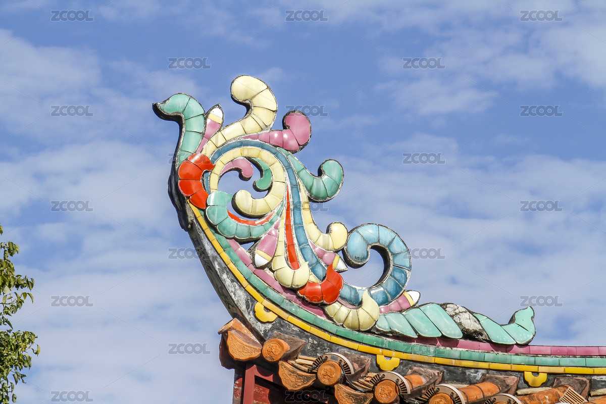 中国福州古建筑坡屋面顶的琉璃彩塑