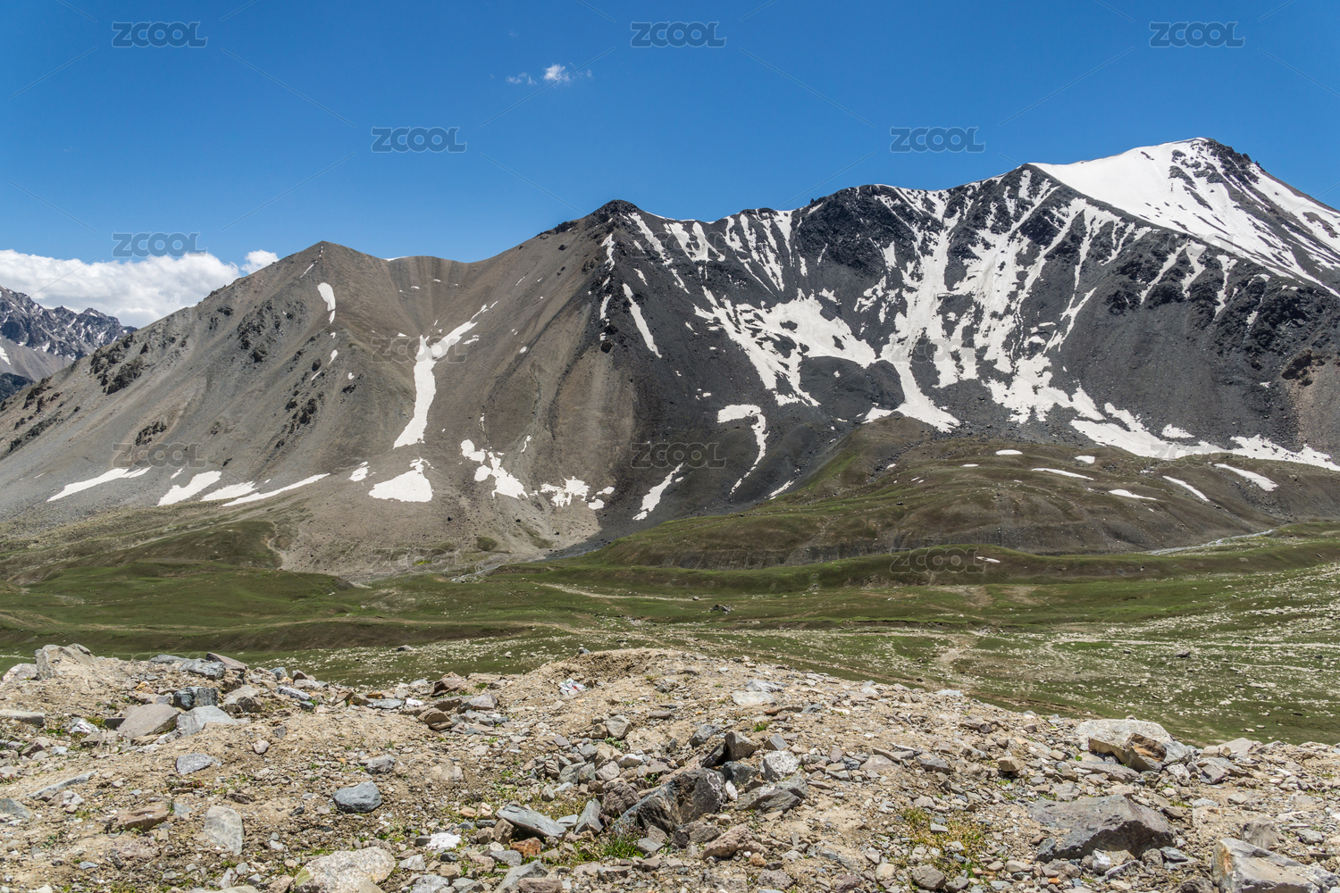 中国新疆夏季蓝天白云下高山草原G217独库公路砂石路段