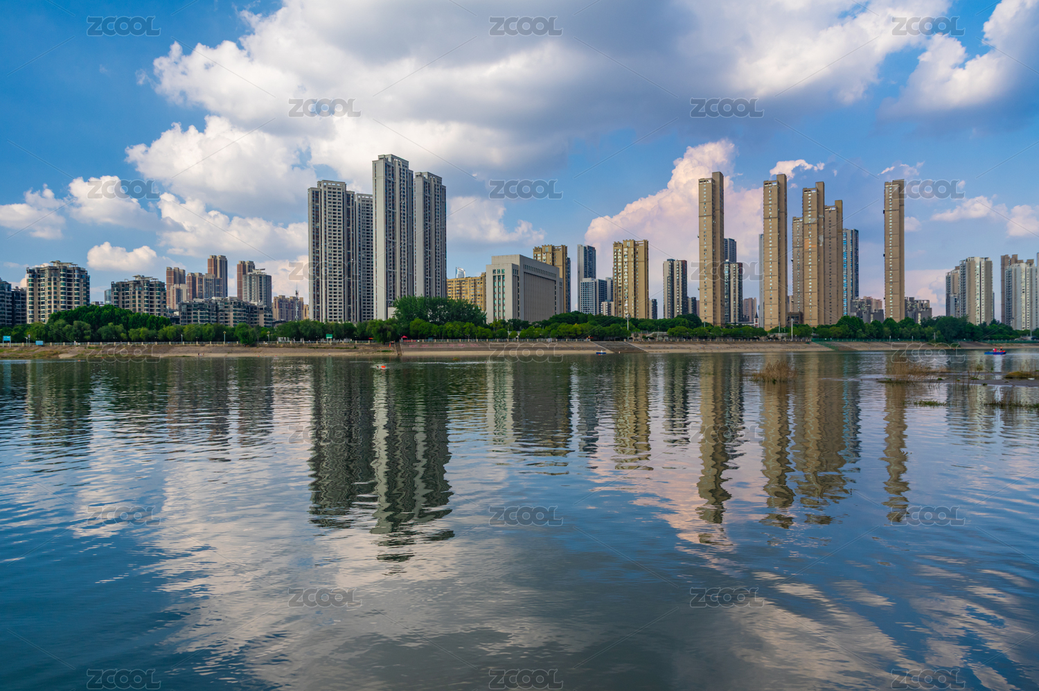 南宁南湖公园蓝天白云与城市摩天大楼建筑