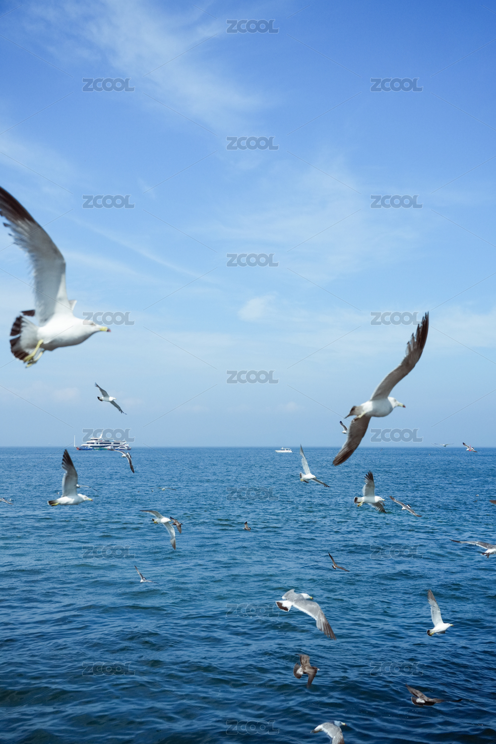 天空之下海鸥群飞过蓝色大海