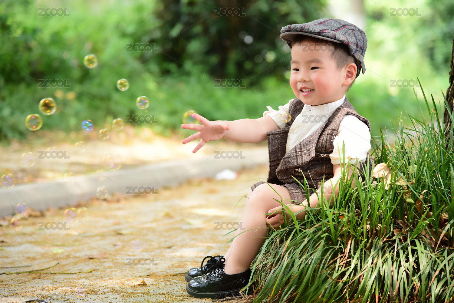 阳光下林荫小路上穿着短袖西服坐在草坪上伸手抓泡泡的小男孩