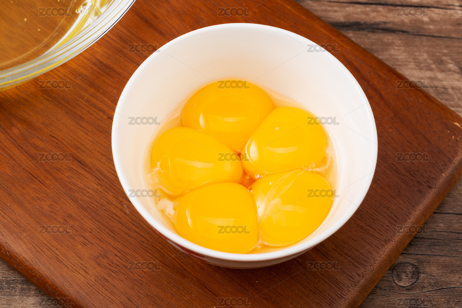 打碎的鸡蛋黄和鸡蛋清放在一个碗里,木纹背景