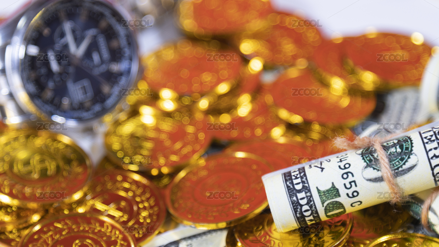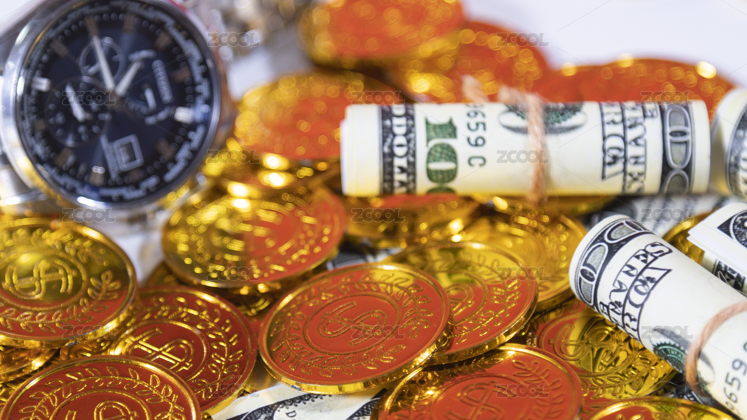 和成捆美元堆放在一起的金币