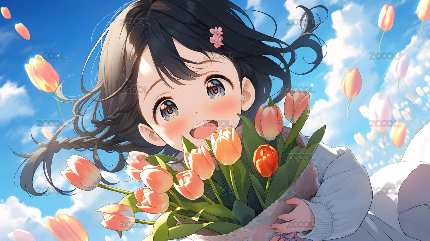 手捧鲜花的动漫插画女孩