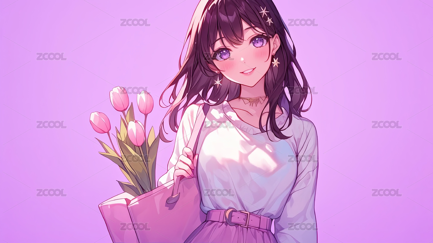 梦幻紫色背景中拿着鲜花的动漫女孩