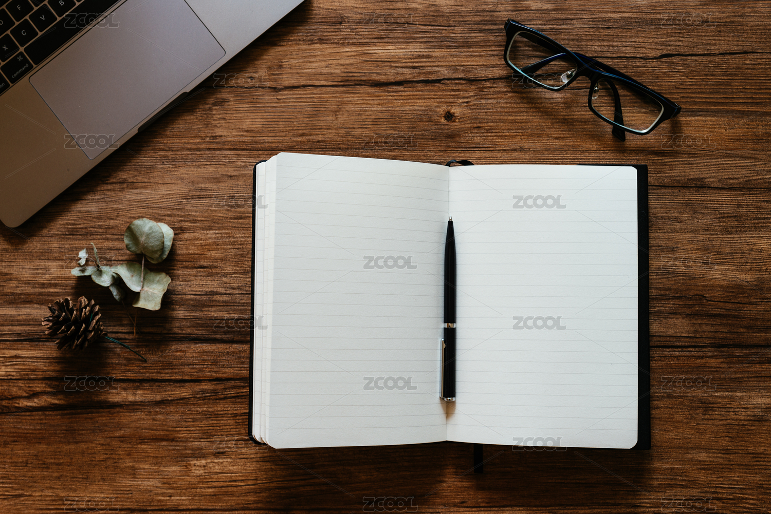 在摆放着眼镜、水杯等物品的桌面上 书写的场景