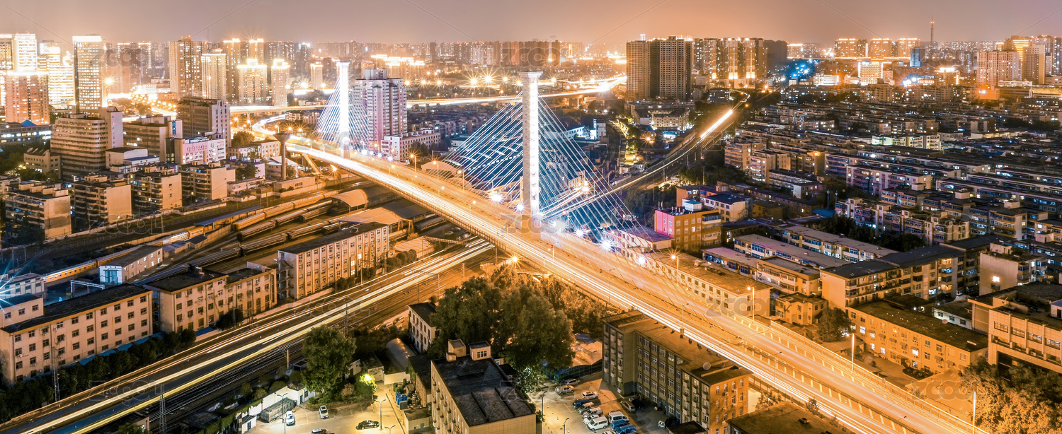夏季郑州市跨铁路彩虹桥夜景风光