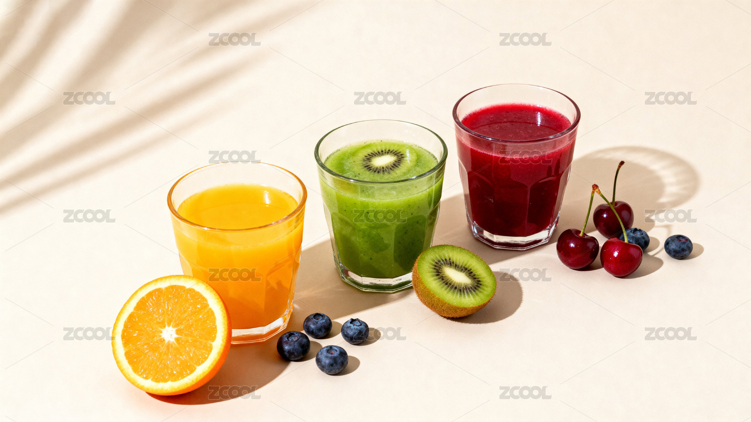 三杯色彩鲜艳的果汁与新鲜水果