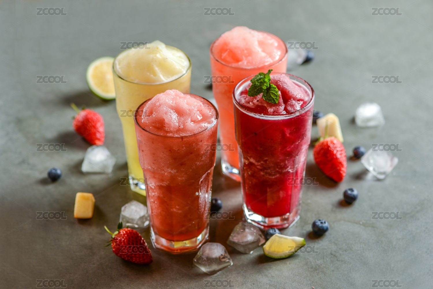 深色背景下搭配水果的四杯冰沙饮品