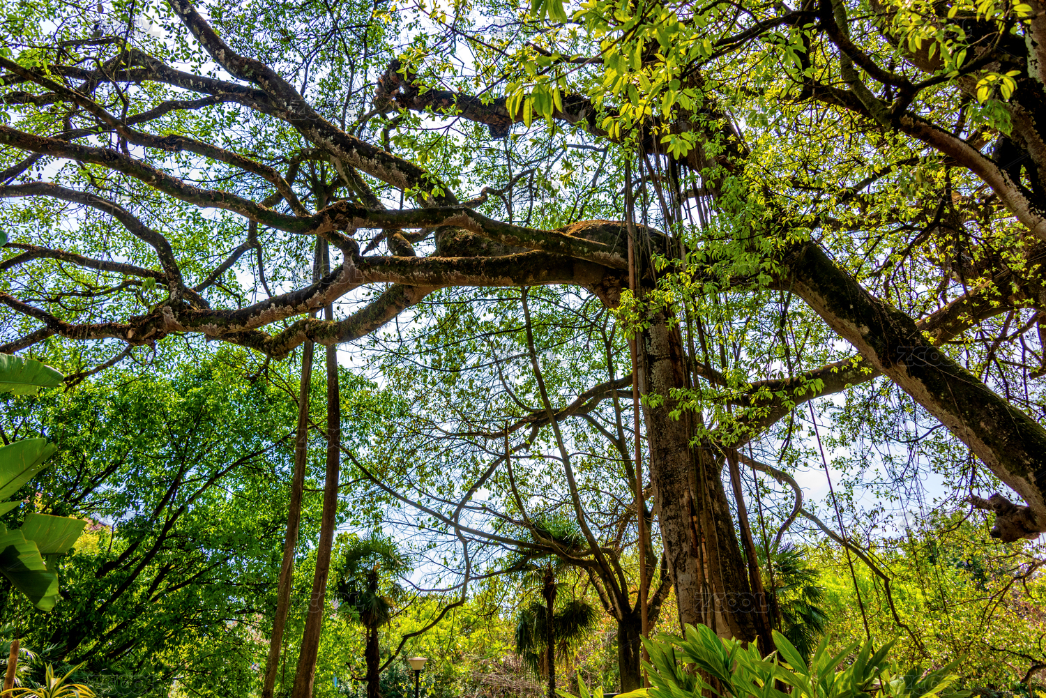 公园里蓬勃生长的黄葛树/黄桷树的树下视角