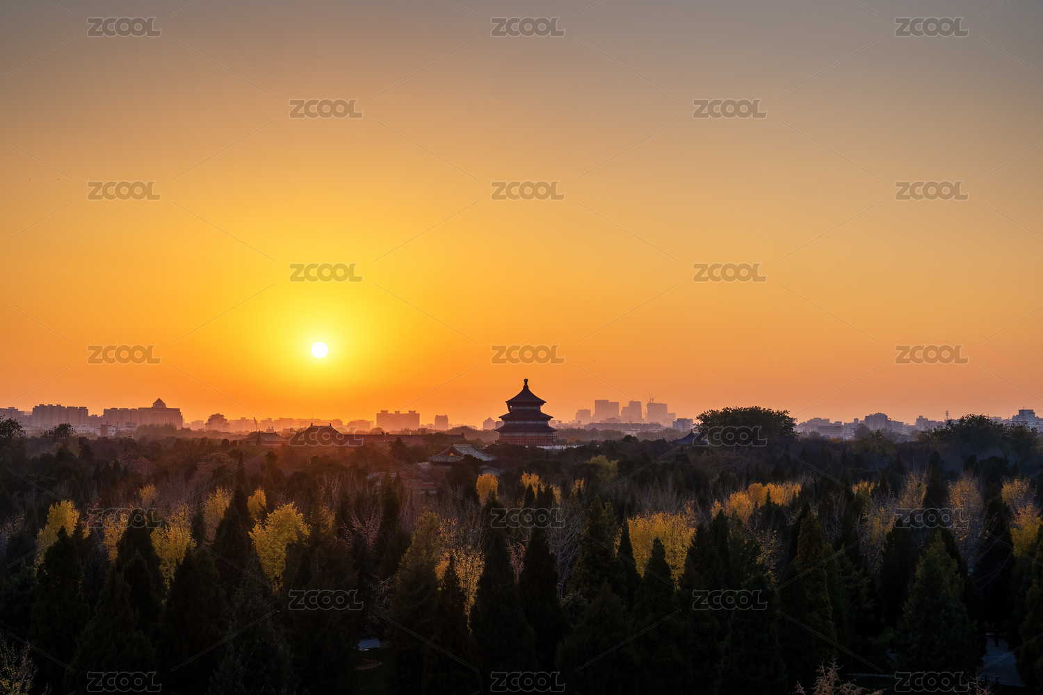 高角度拍摄北京天坛公园祈年殿夕阳