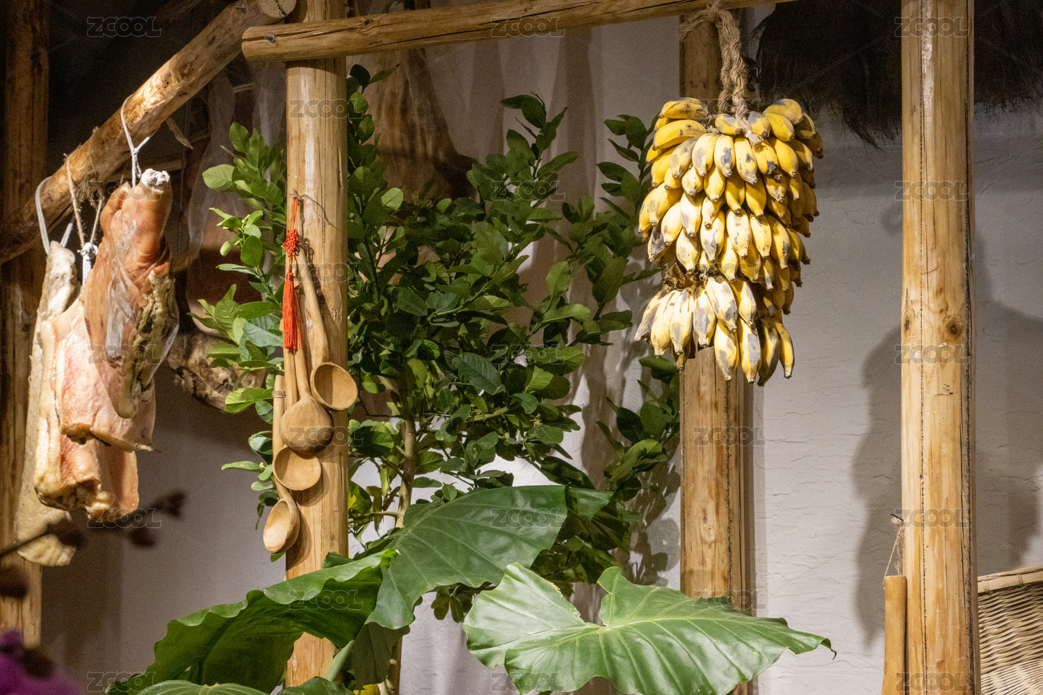 古老村落木墙上挂的农具和农作物