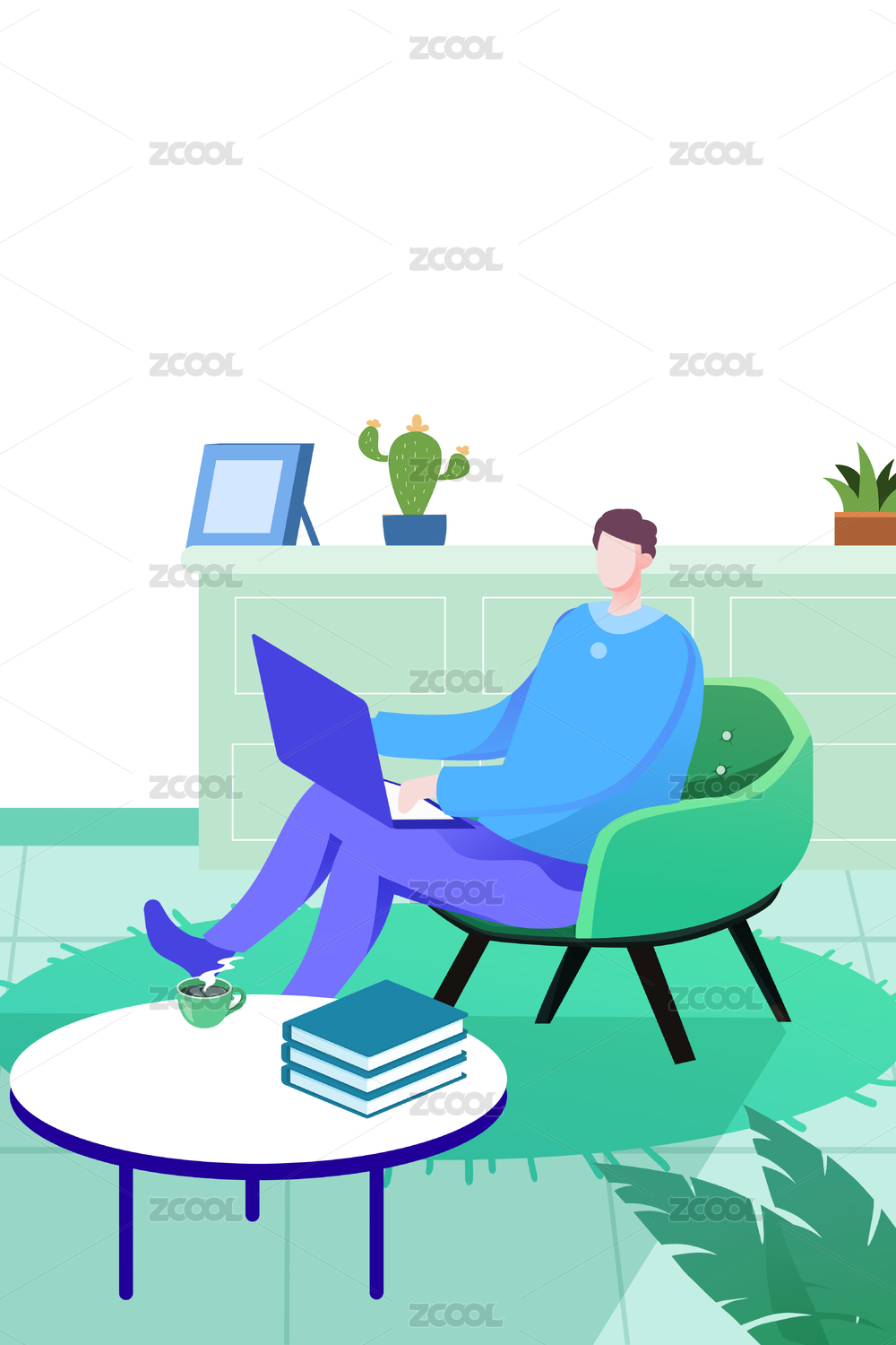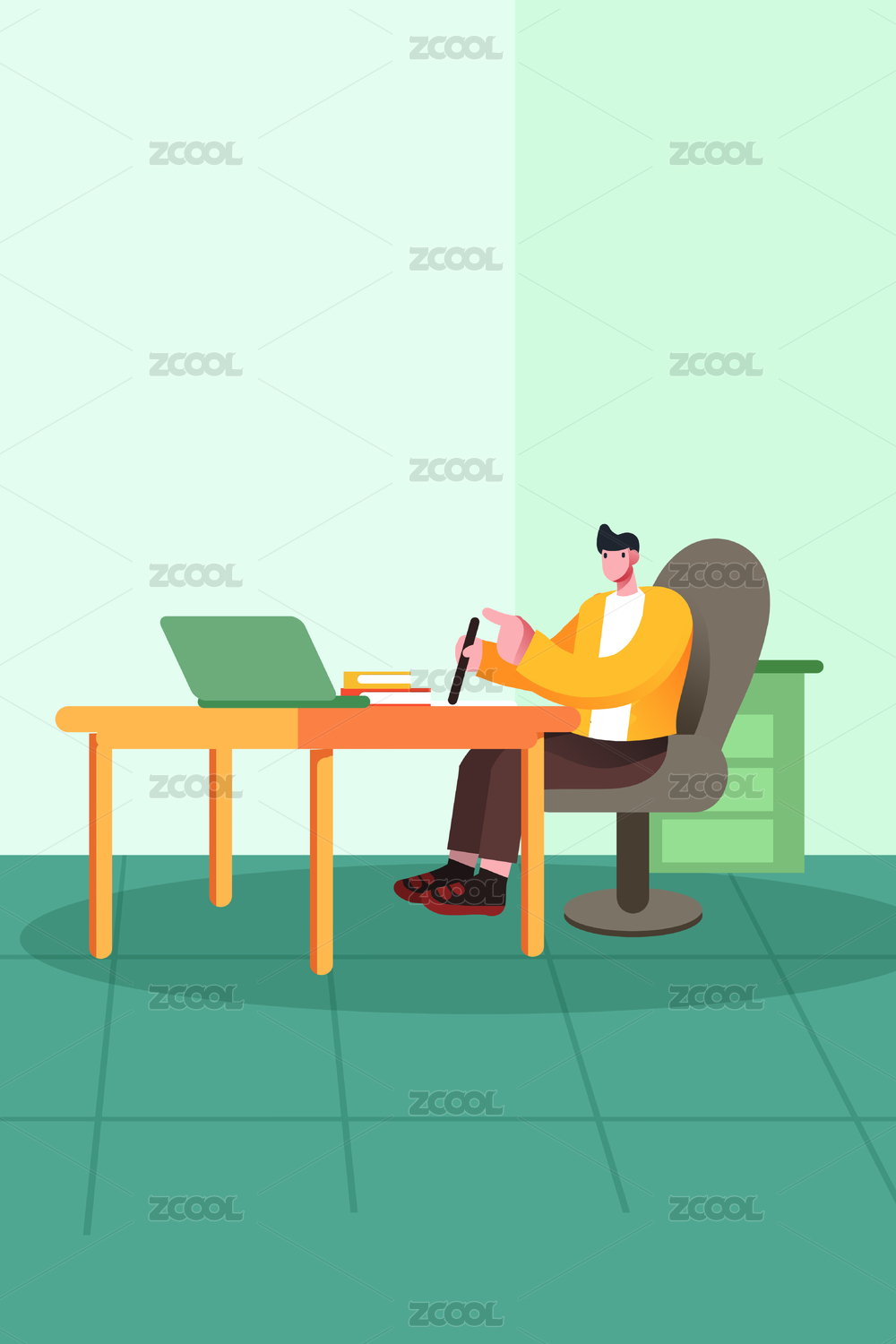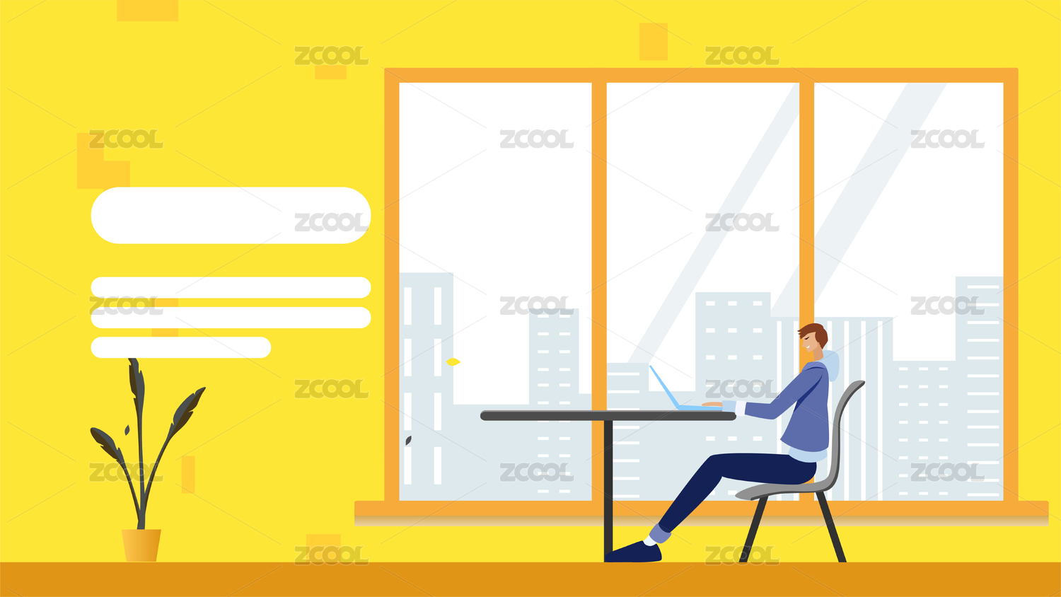 坐在有飘窗的房间的办公桌前 使用电脑办公聊天的穿着休闲服装的男人矢量海报插画背景