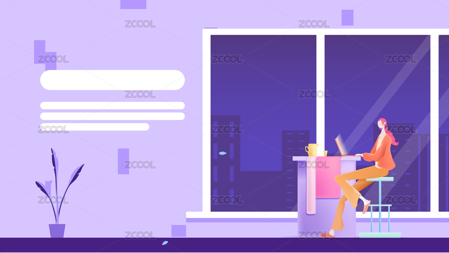 办公桌边 使用电脑办公聊天的加班的白领矢量海报插画背景坐在有飘窗的房间的办公桌前 使用电脑办公聊天的加班的白领矢量海报插画背景