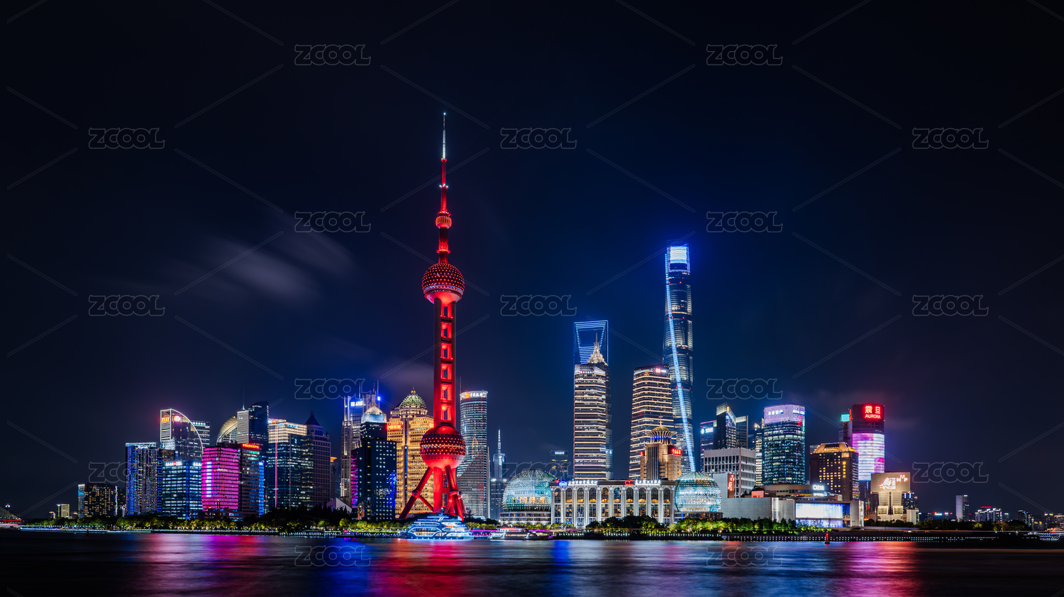 上海陆家嘴金融区城市天际线和东方明珠电视塔夜景