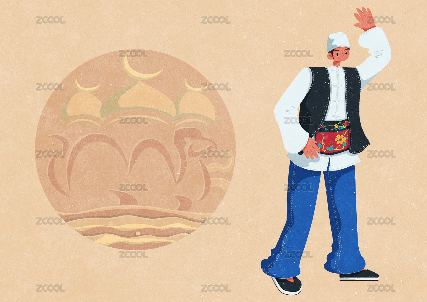 撒拉族,插画,卡通,扁平,少数民族,民族,传统文化,骆驼,沙漠,自然