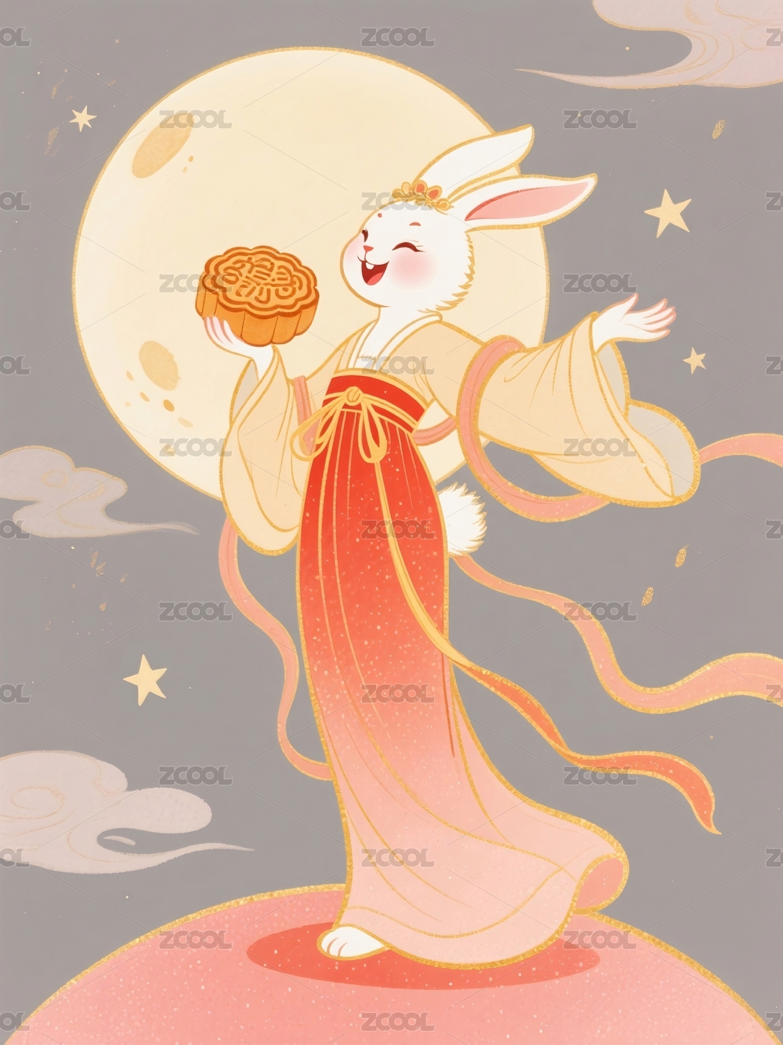 可爱的兔子抱着月饼中秋节节日庆典国潮插画