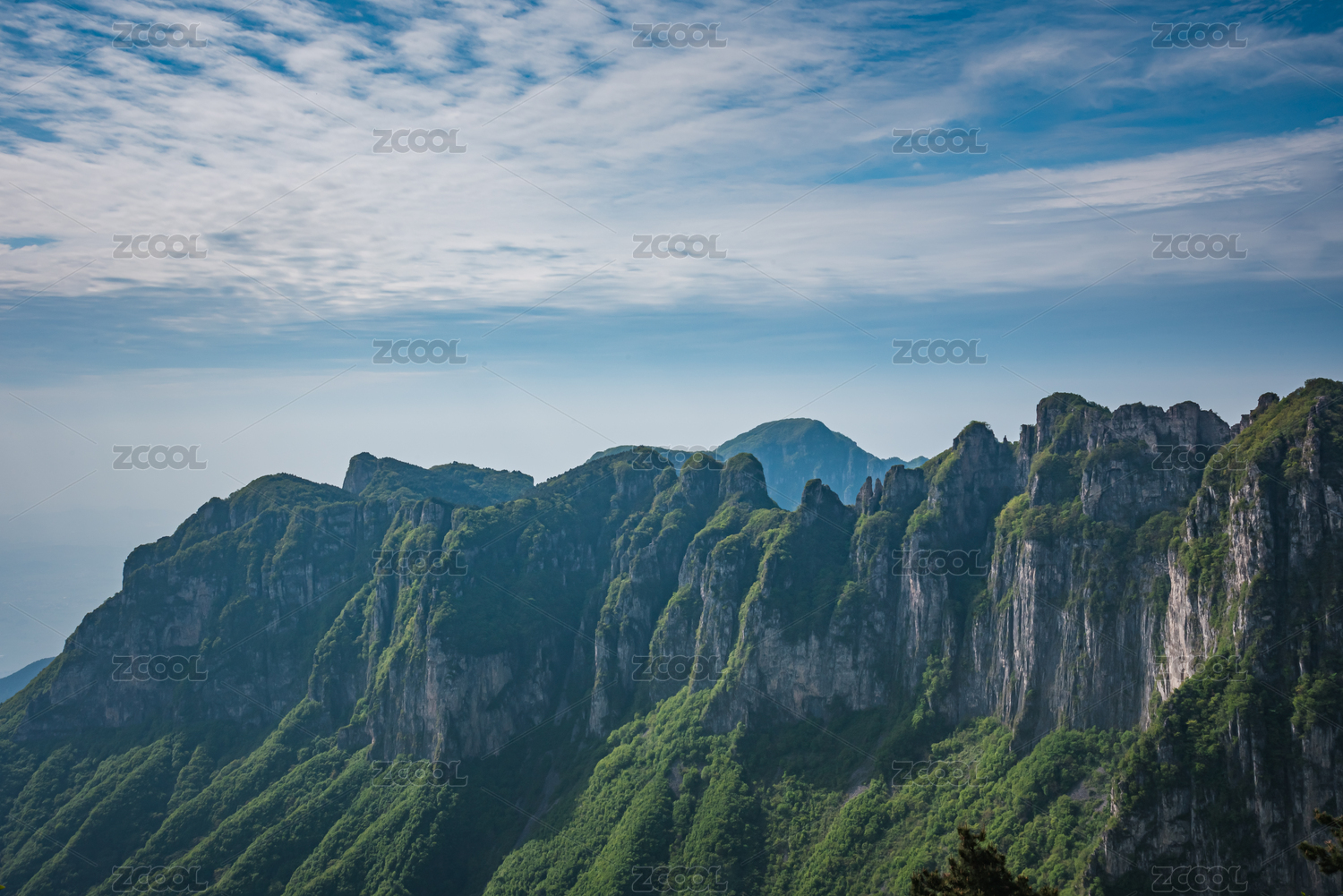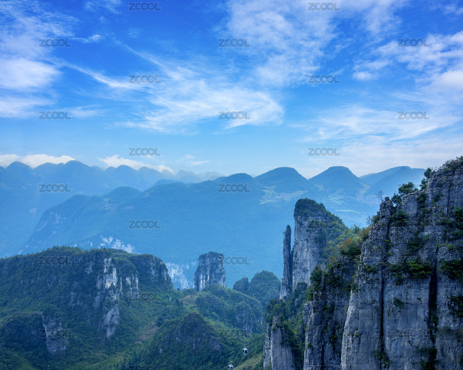 秋日蓝天下的中国湖南张家界天门山景区连绵起伏雄伟的崇山峻岭