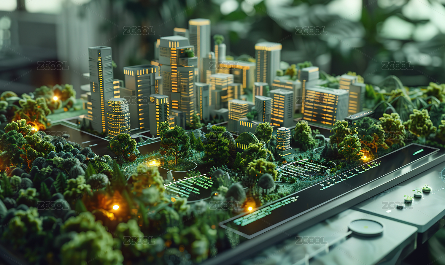 房产沙盘里有汽车行驶的道路及绿地行道树等模型