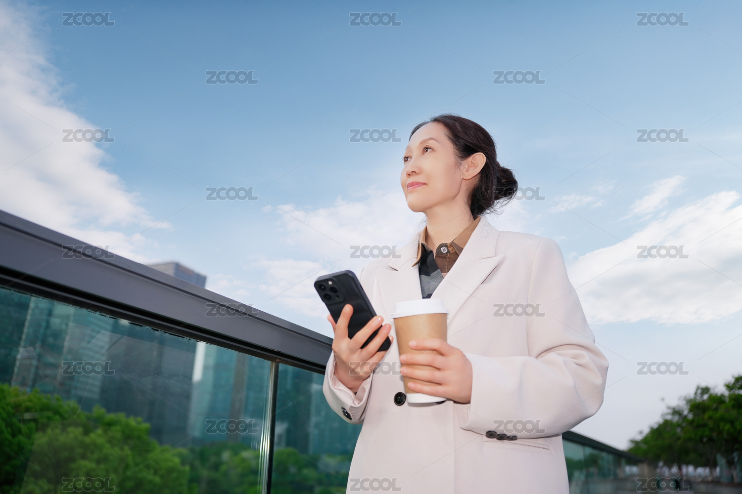 专业女性使用智能手机手持咖啡城市景观