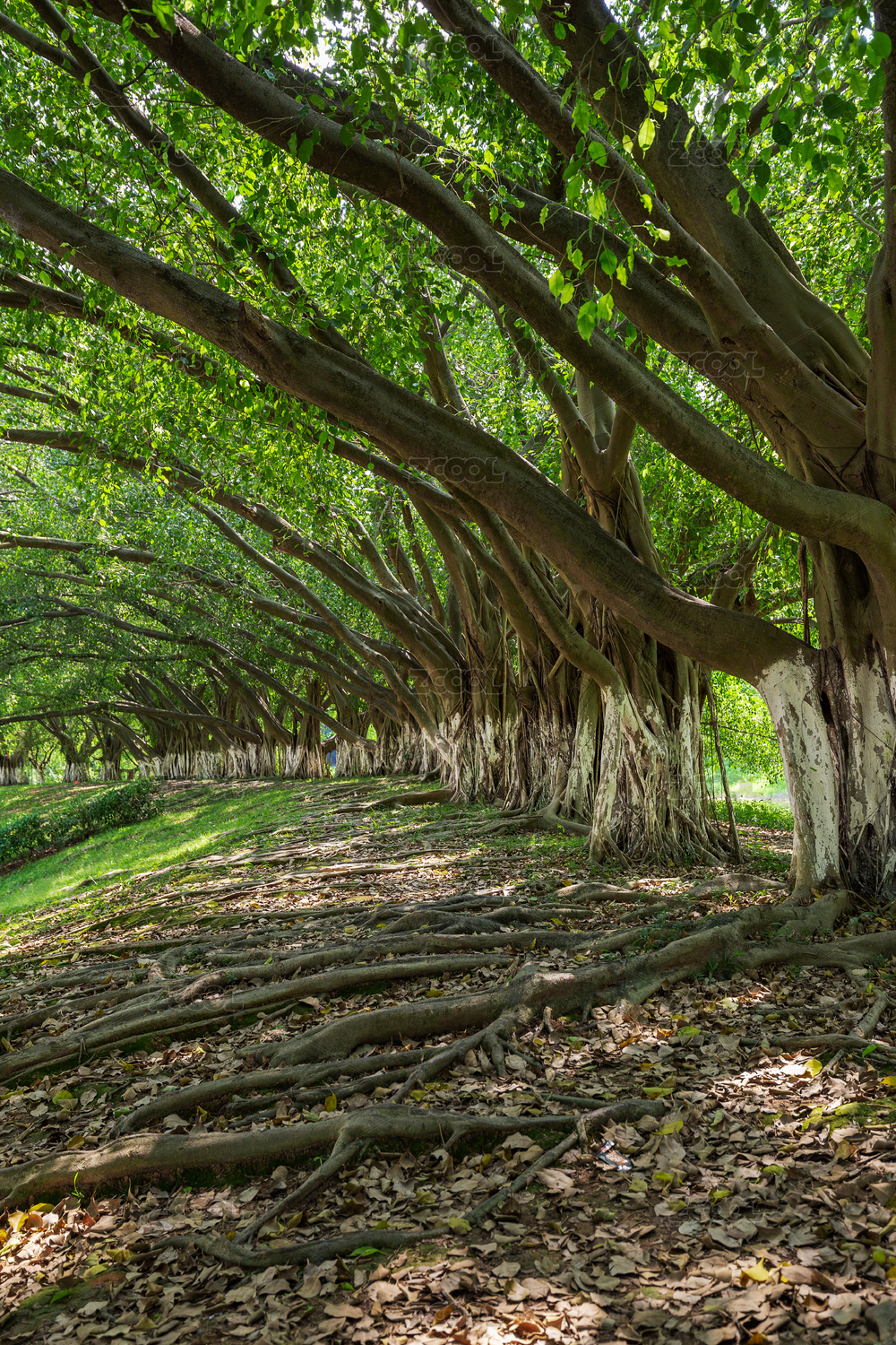 公园里茂盛的根系发达的榕树