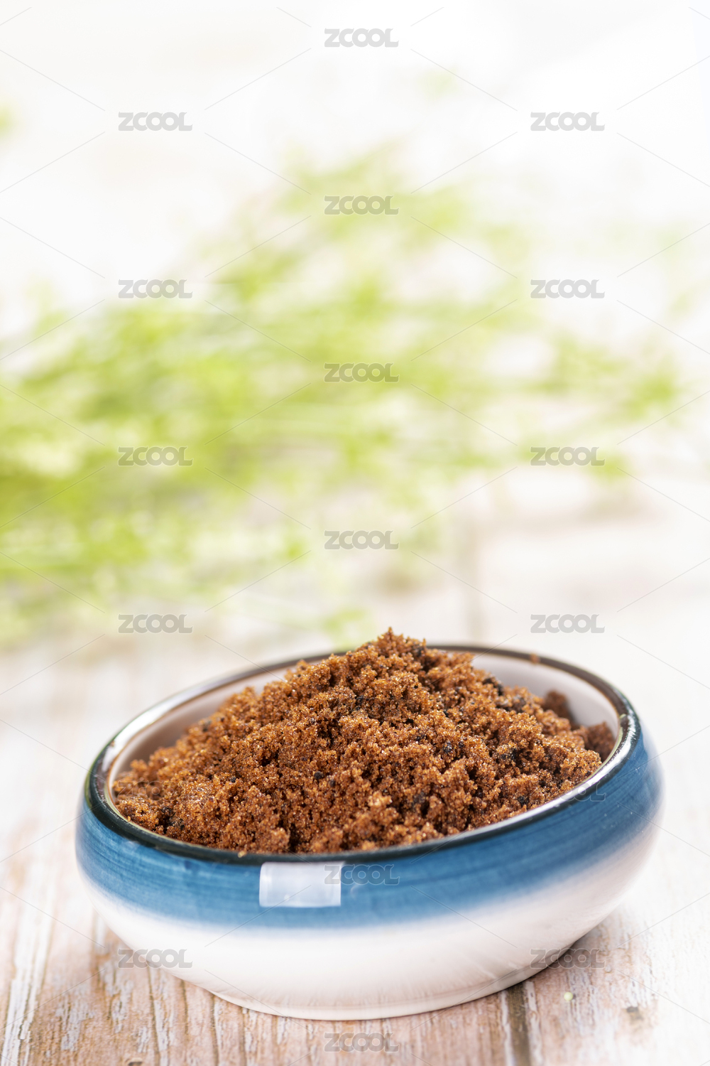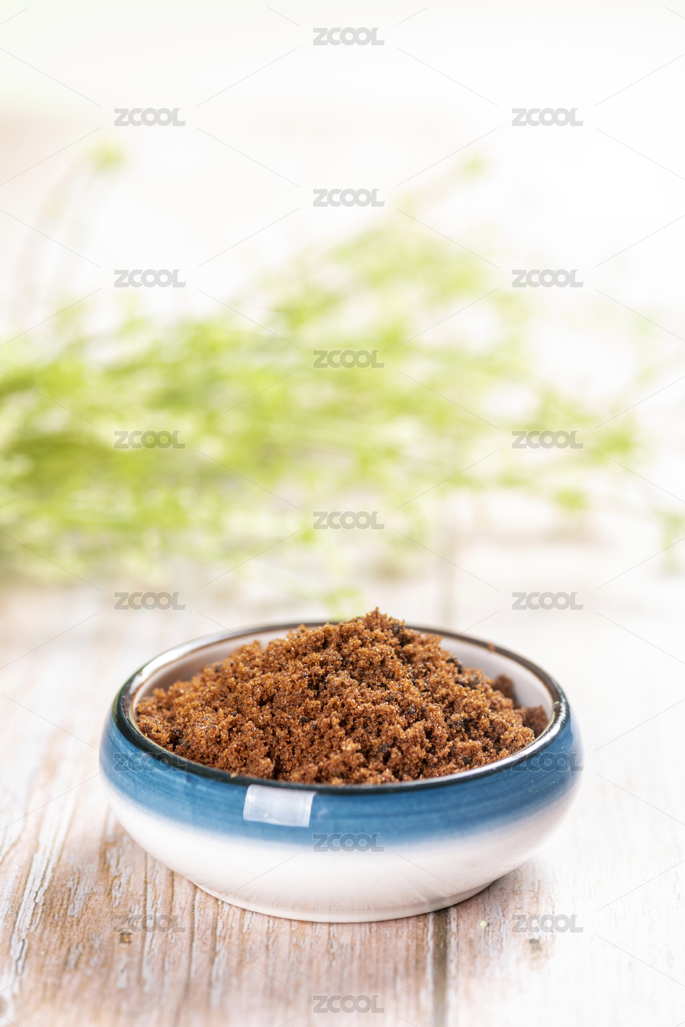 木桌背景味碟中调味品红糖粉