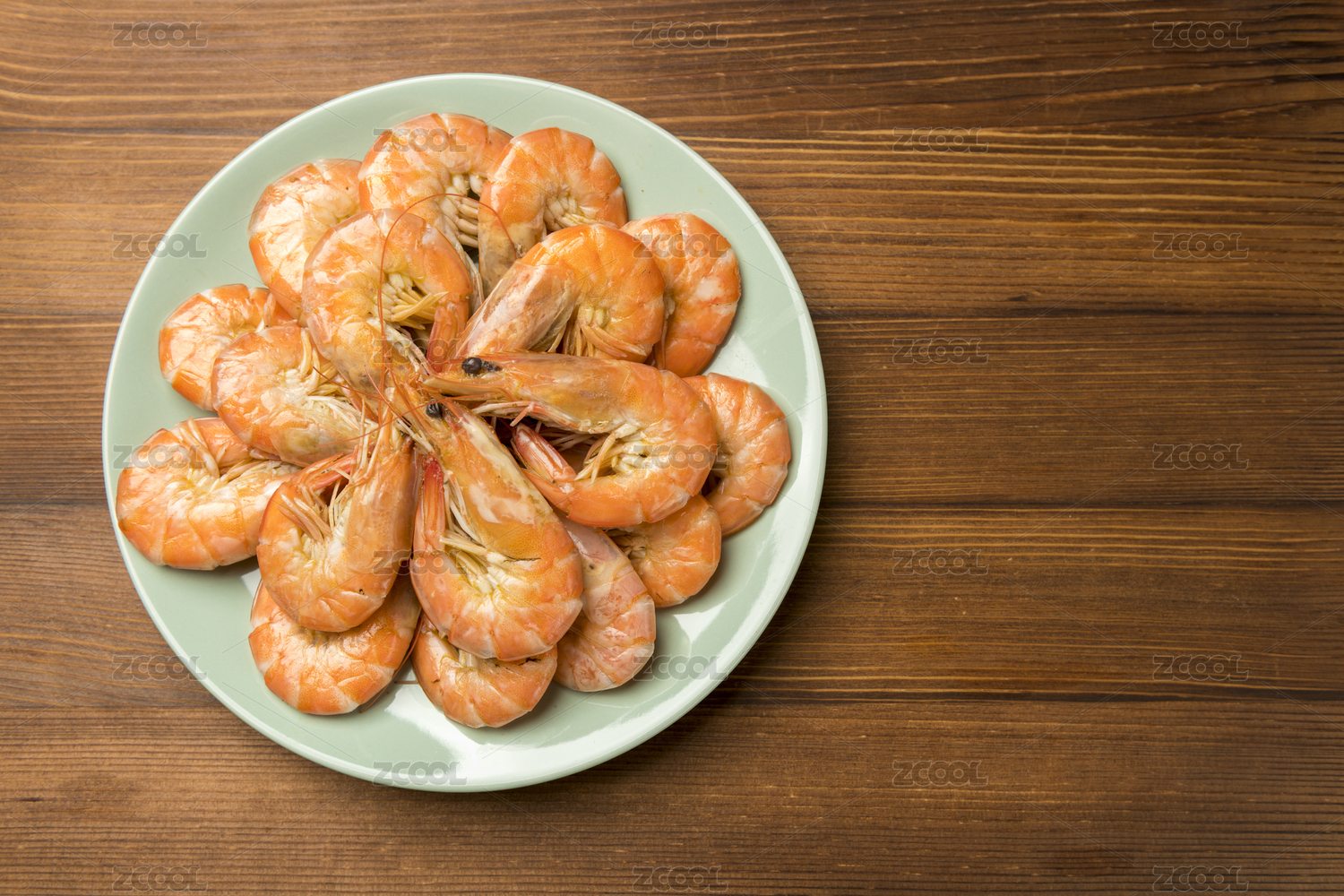 一盘水煮虾摆放在桌面上特写