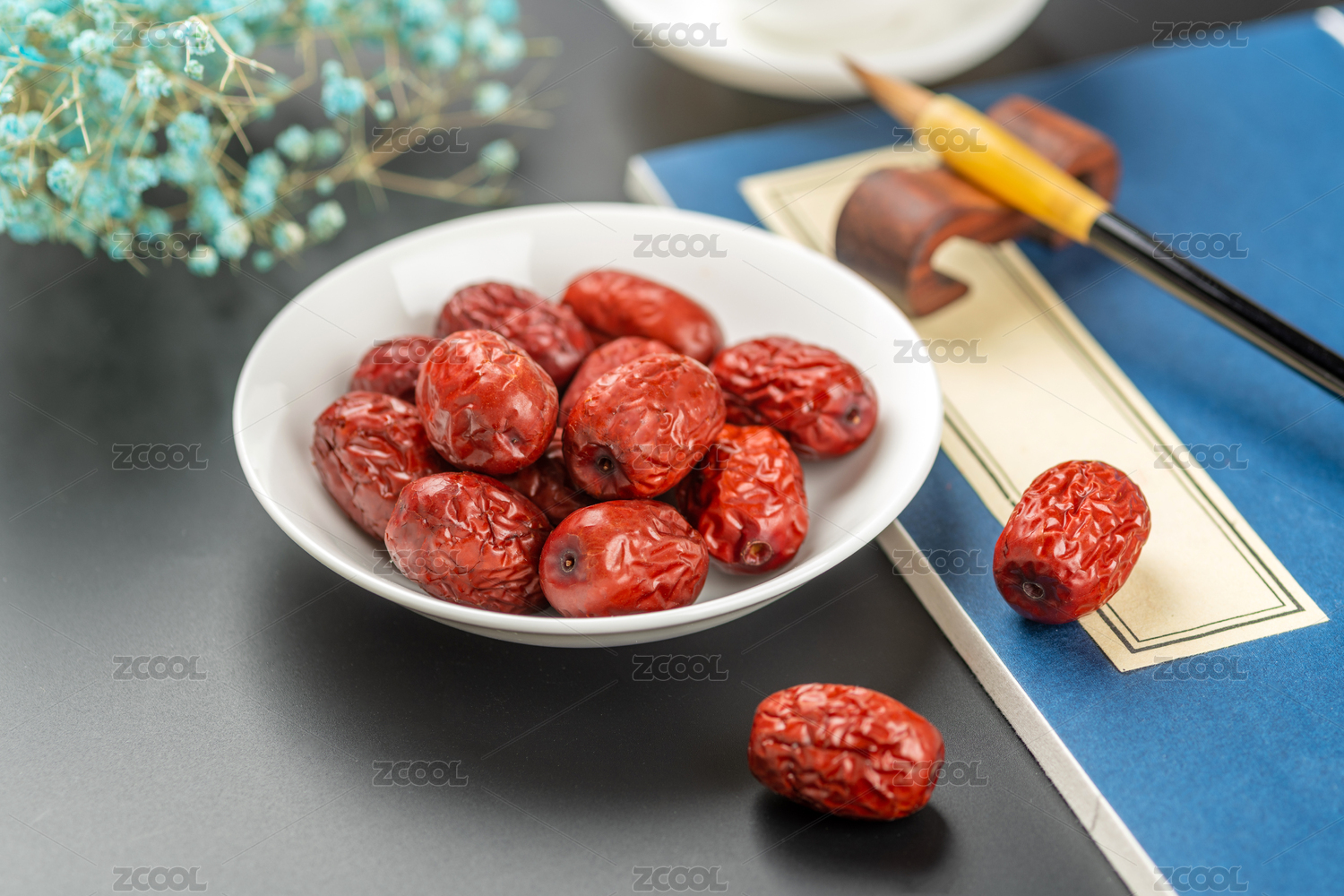 传统中式背景中装在黑色碗里的干枣
