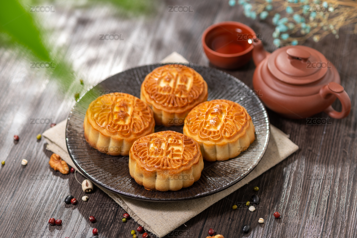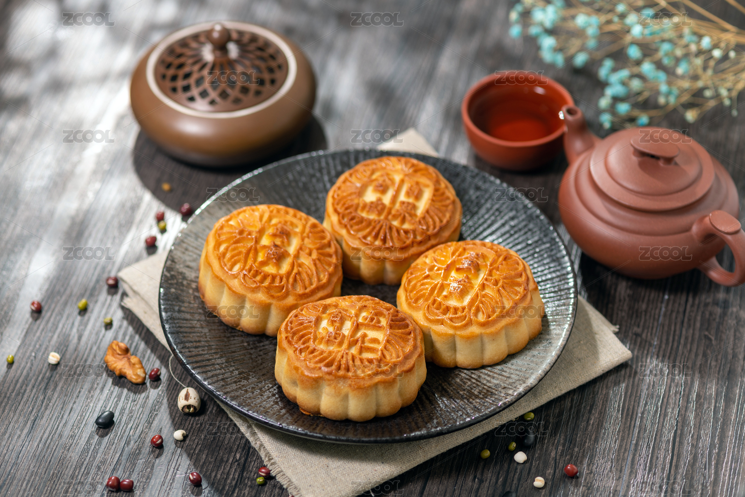一盘中秋节美食月饼摆放在中式桌面上