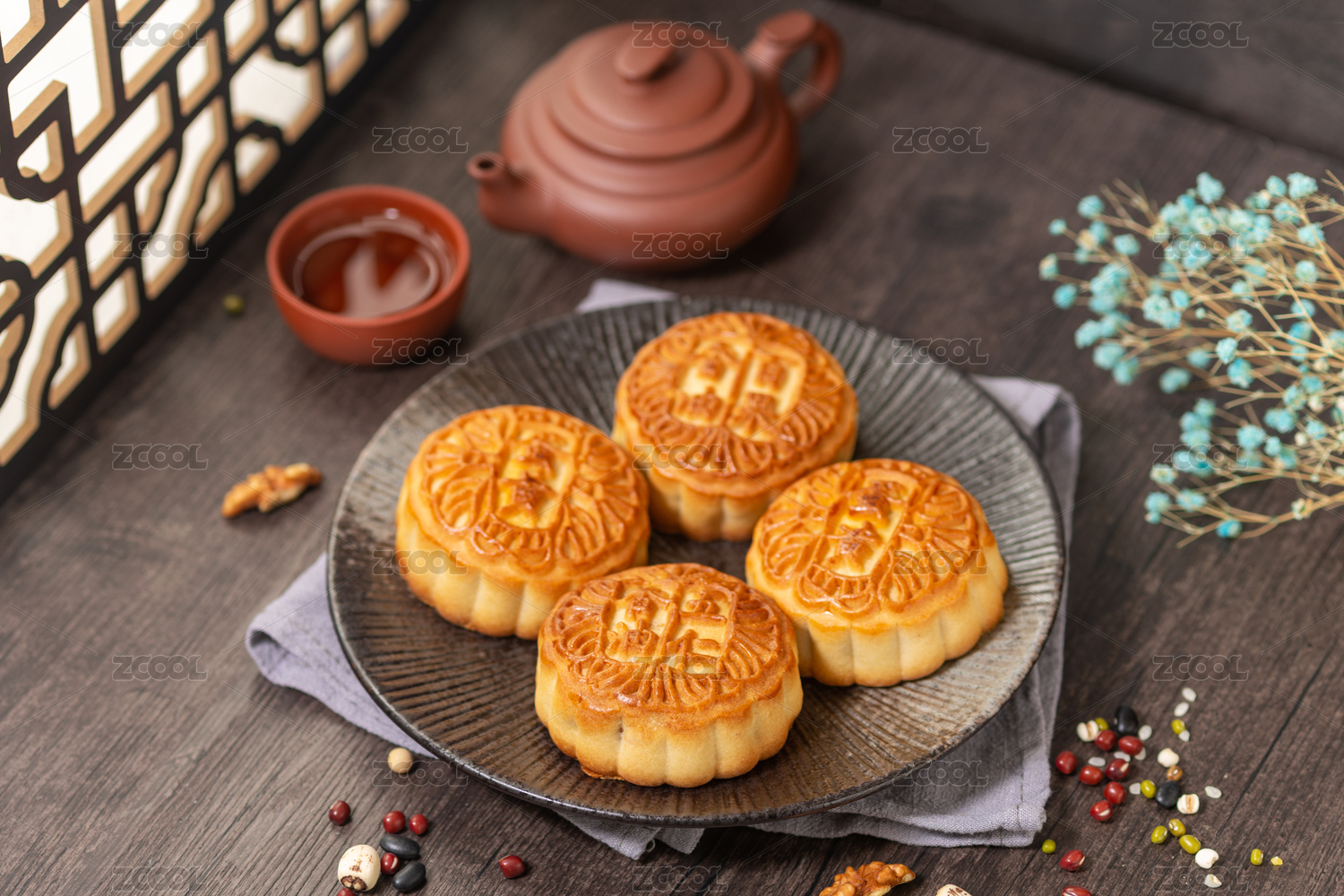 中秋节传统美食月饼与茶水特写古窗棂木桌面