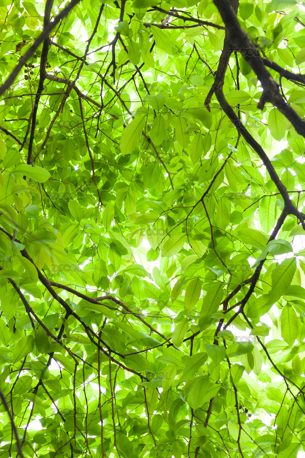 仰拍春天大树新长出的嫩绿的新枝