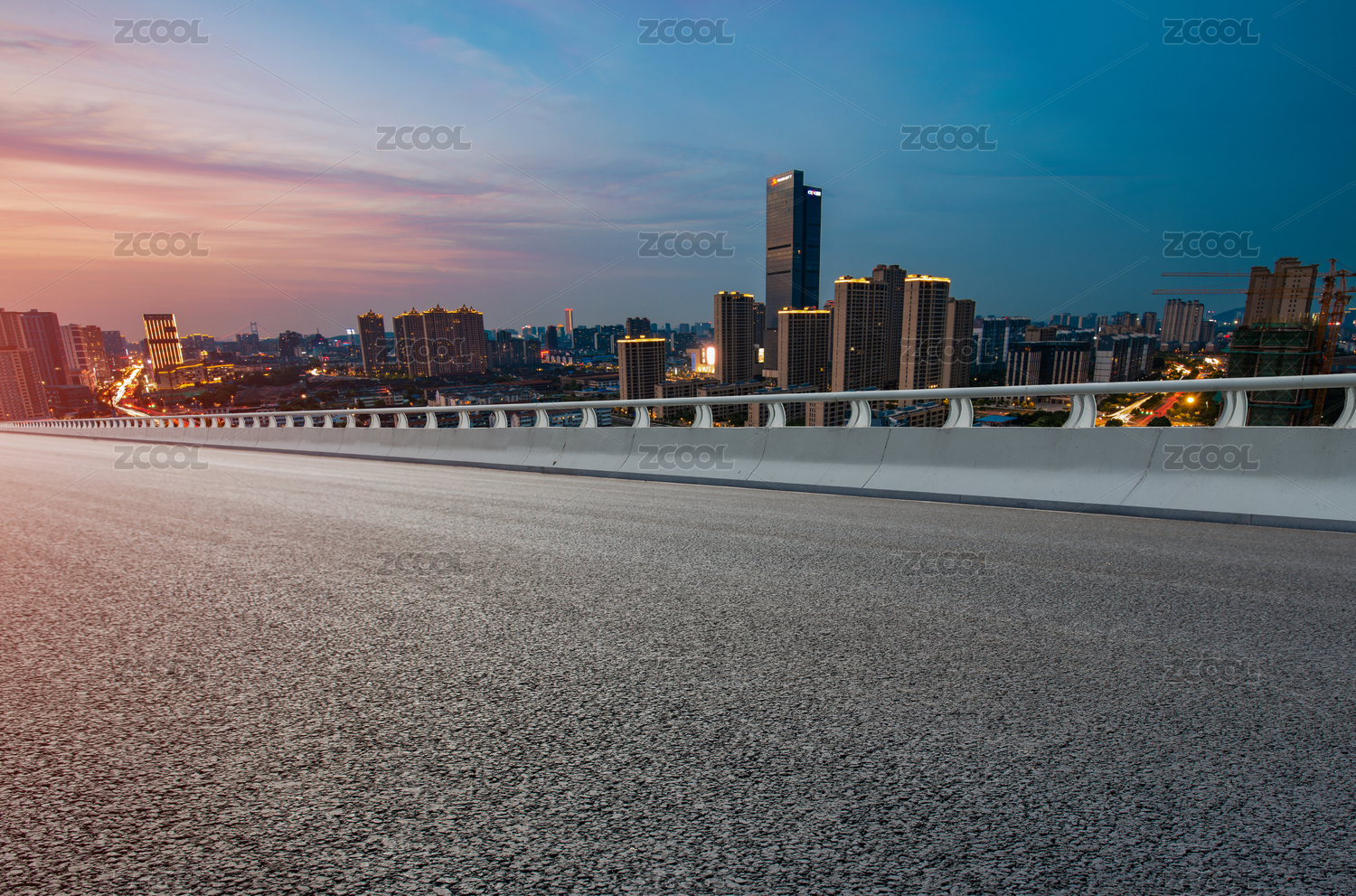 黄昏时分,前景为沥青道路的郑州城市景观和城市天际线