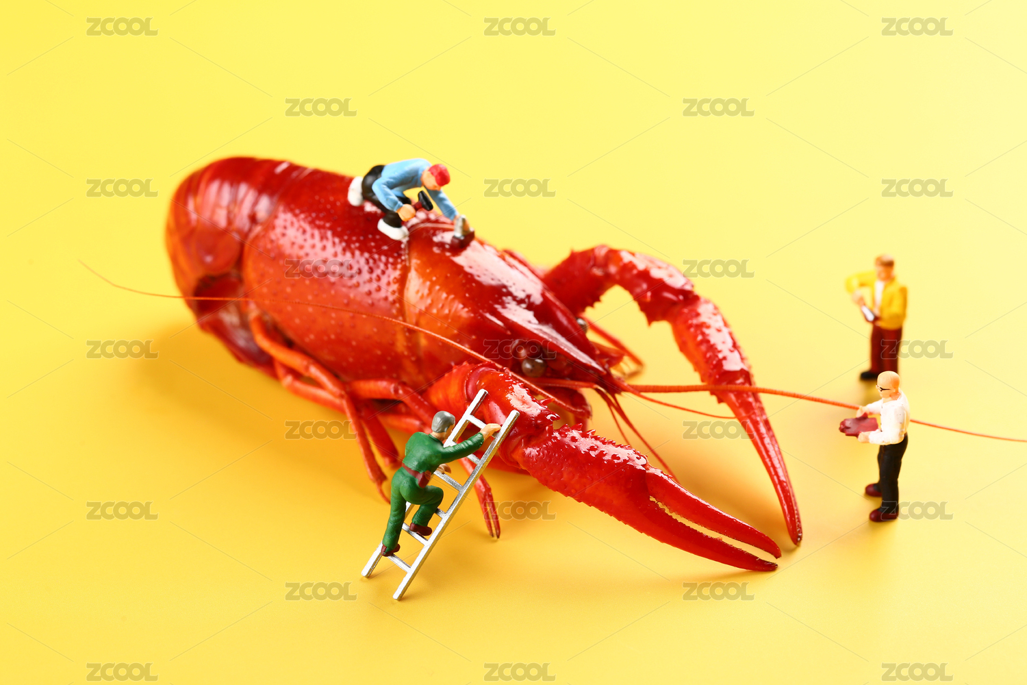 迷你小人和小龙虾 微拍小龙虾 缩微摄影小龙虾