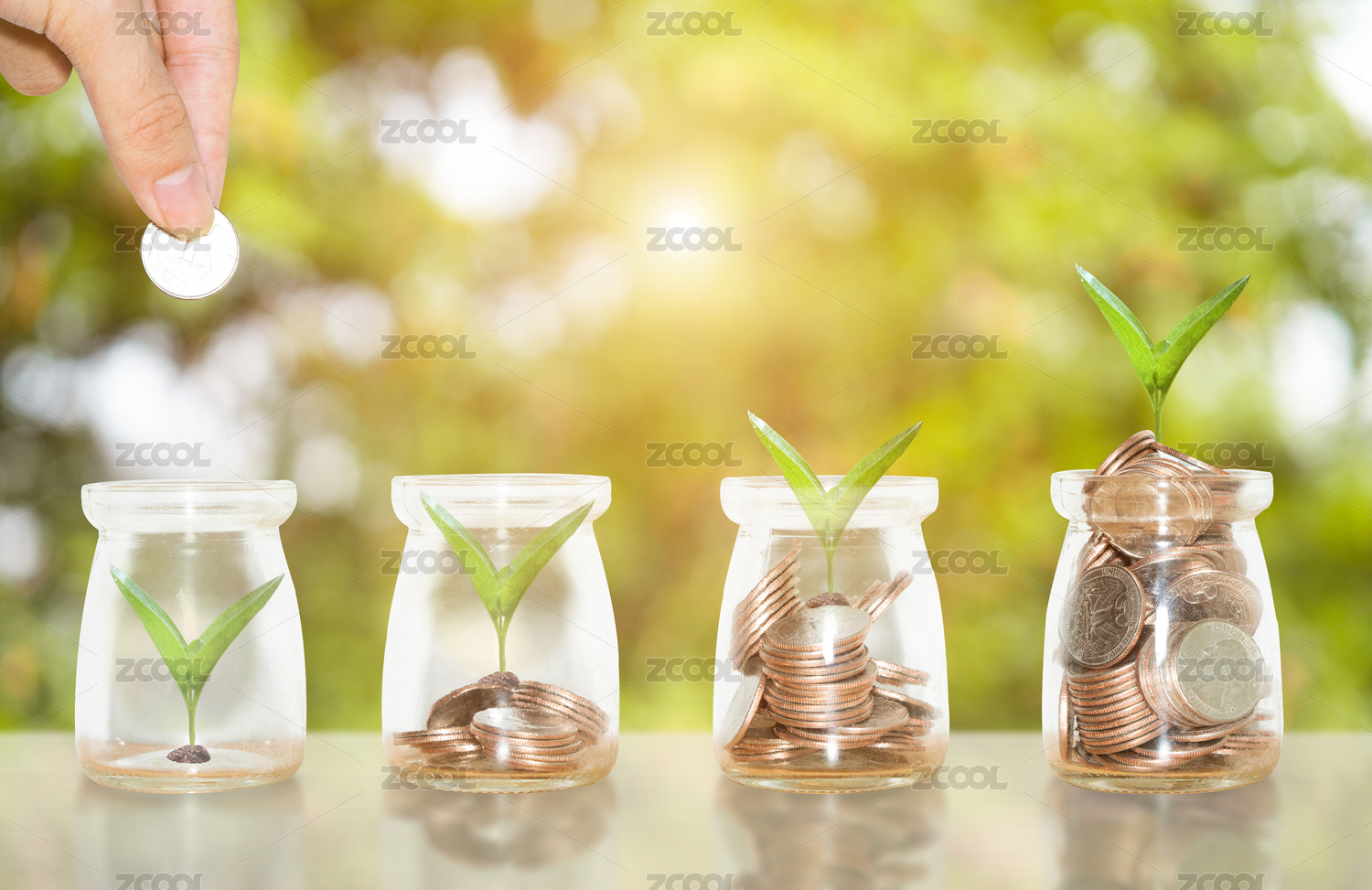 装满美元硬币的瓶子里长出绿植和一排递减的美元硬币