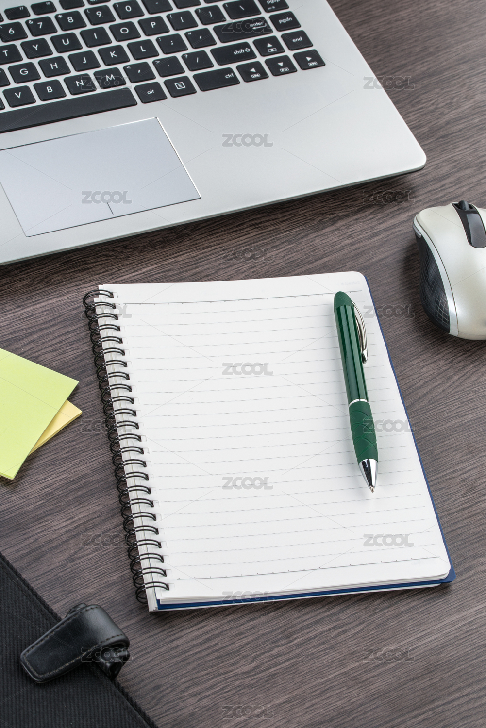 笔记本电脑,笔记本和笔在桌子上粘性便签