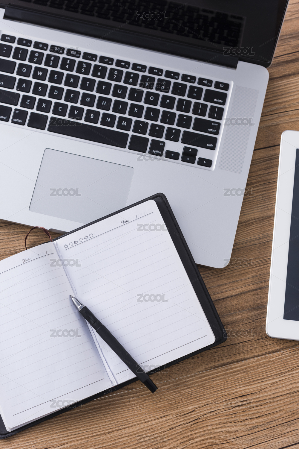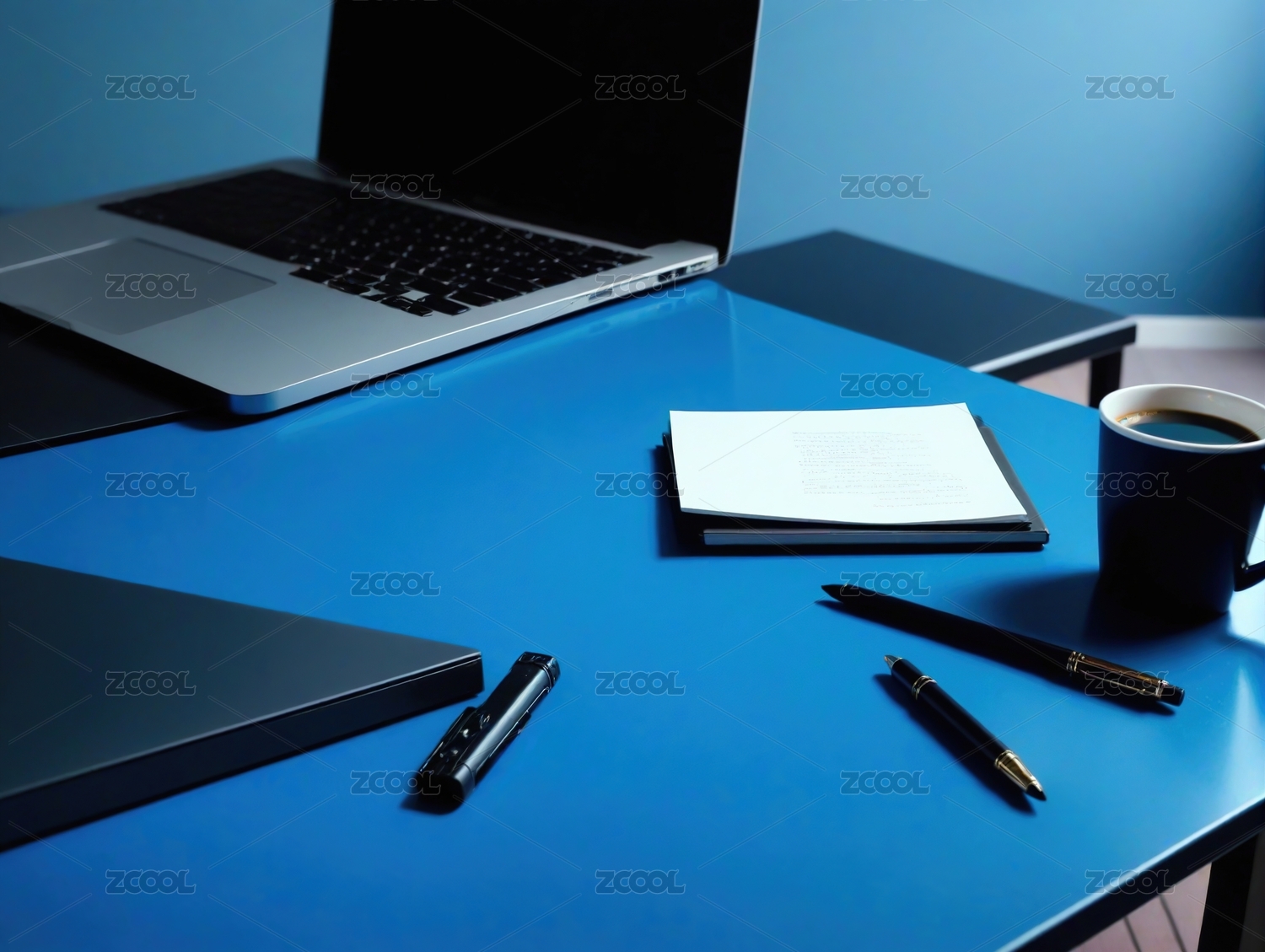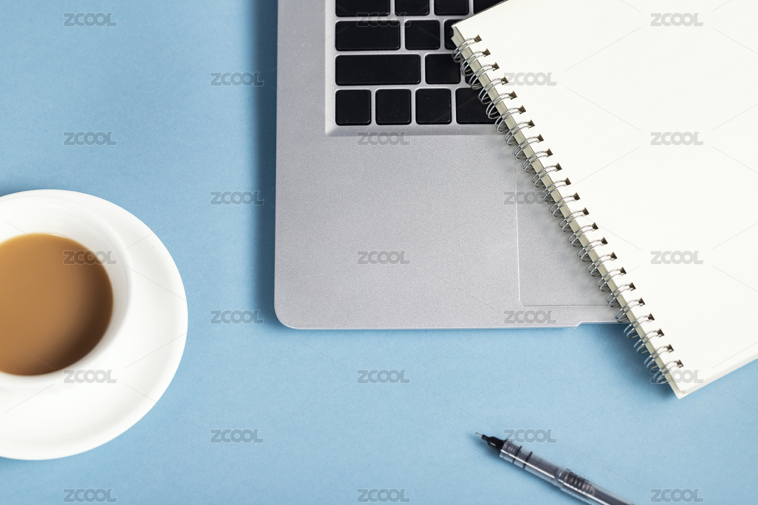 办公桌上空白的笔记本电脑、日记本、笔和一杯咖啡