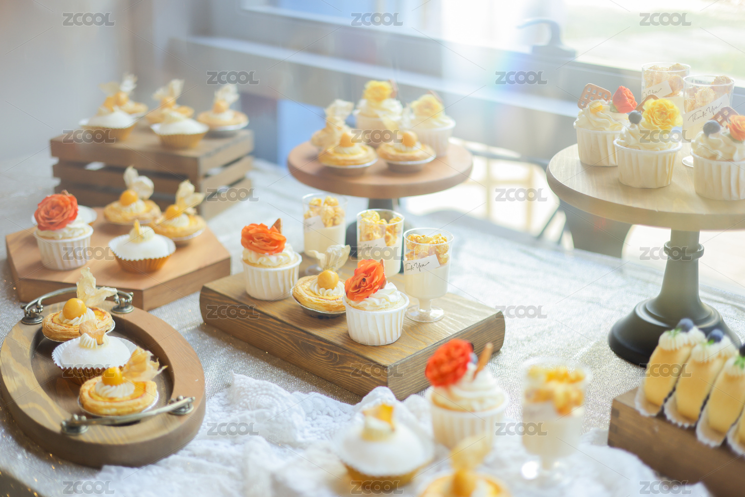 各种精致的甜品摆放在木质的桌子上。
