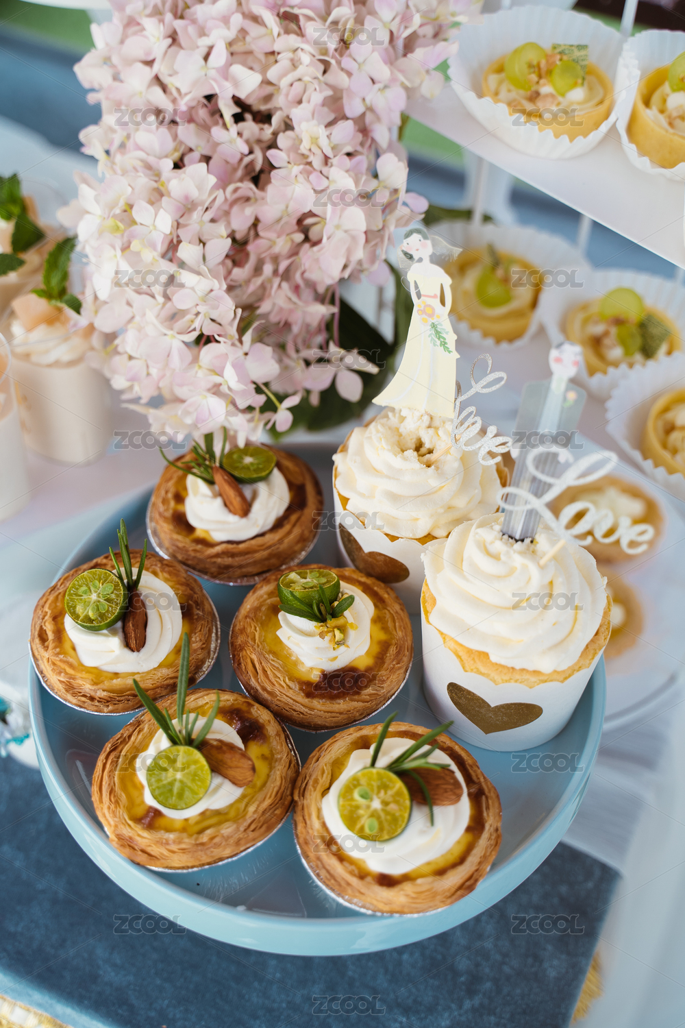 杯子蛋糕和奶油甜点摆放在托盘上。