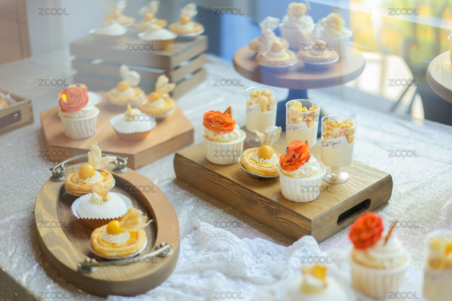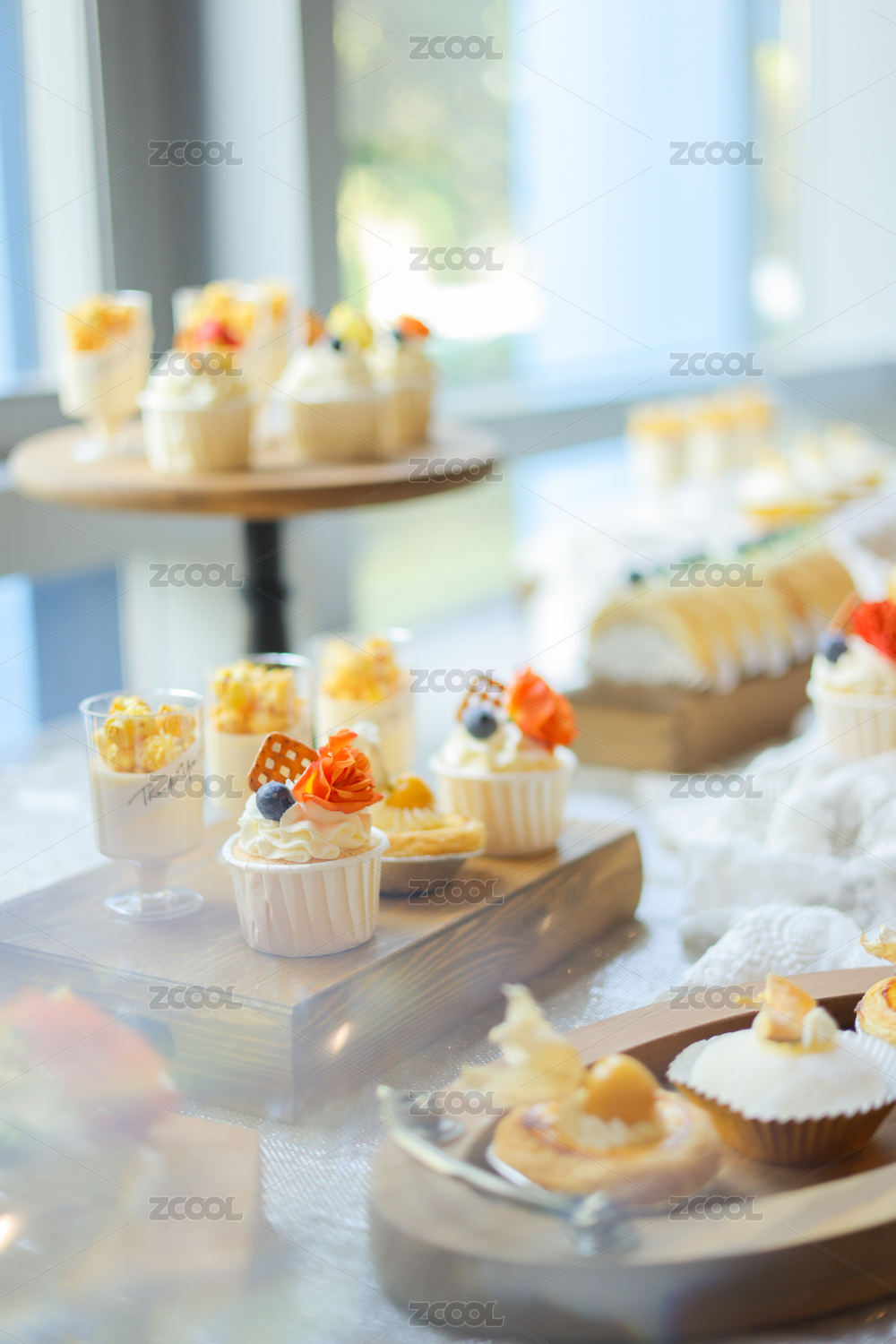 精致的甜品摆放在木质的桌子上。