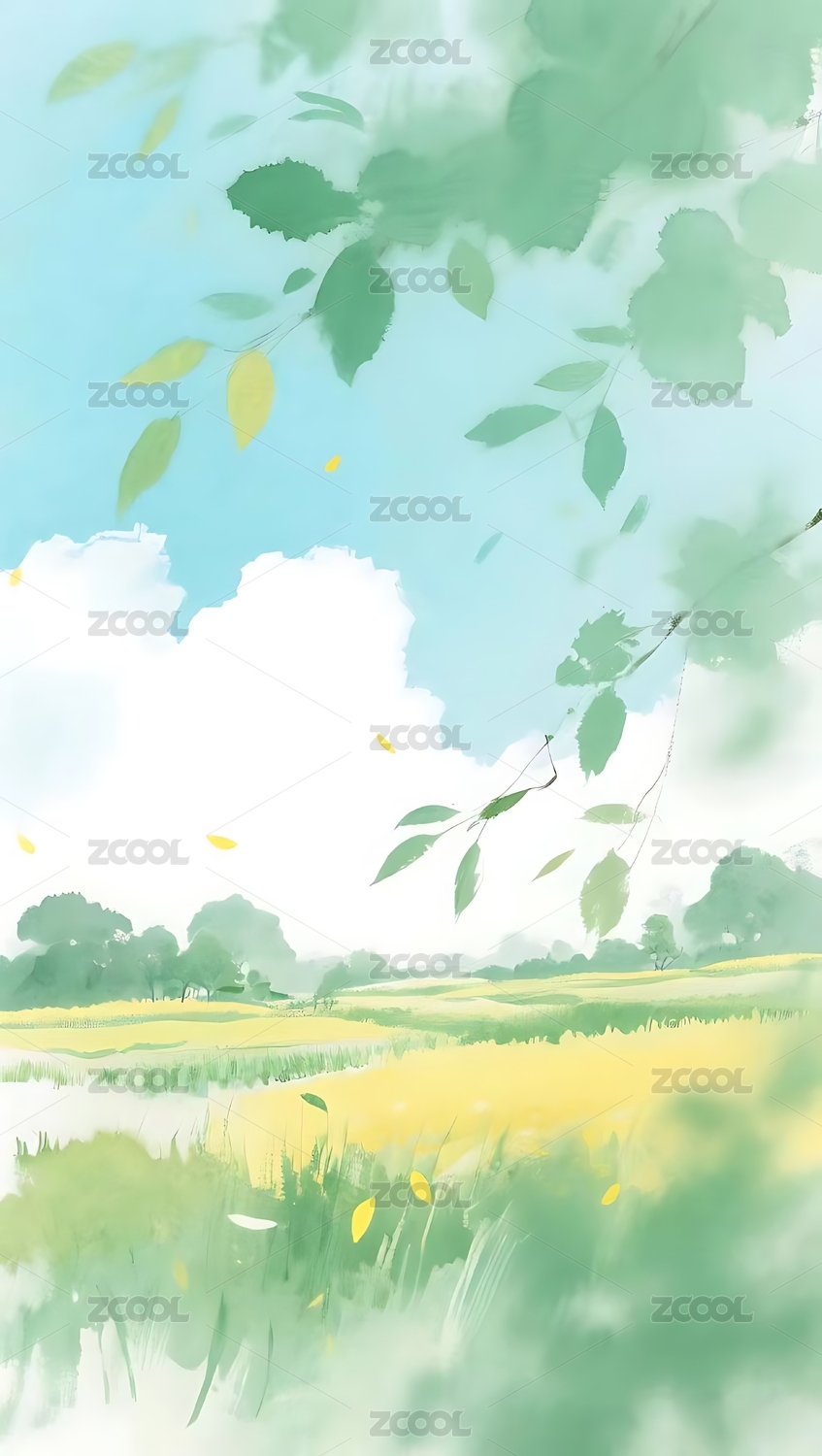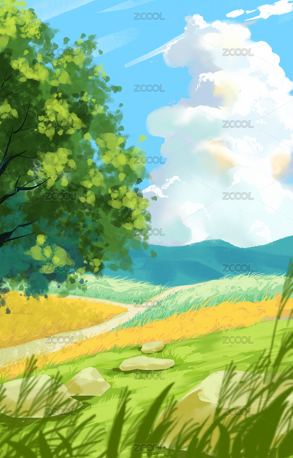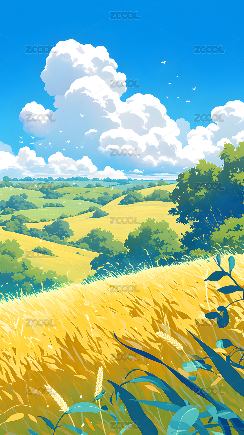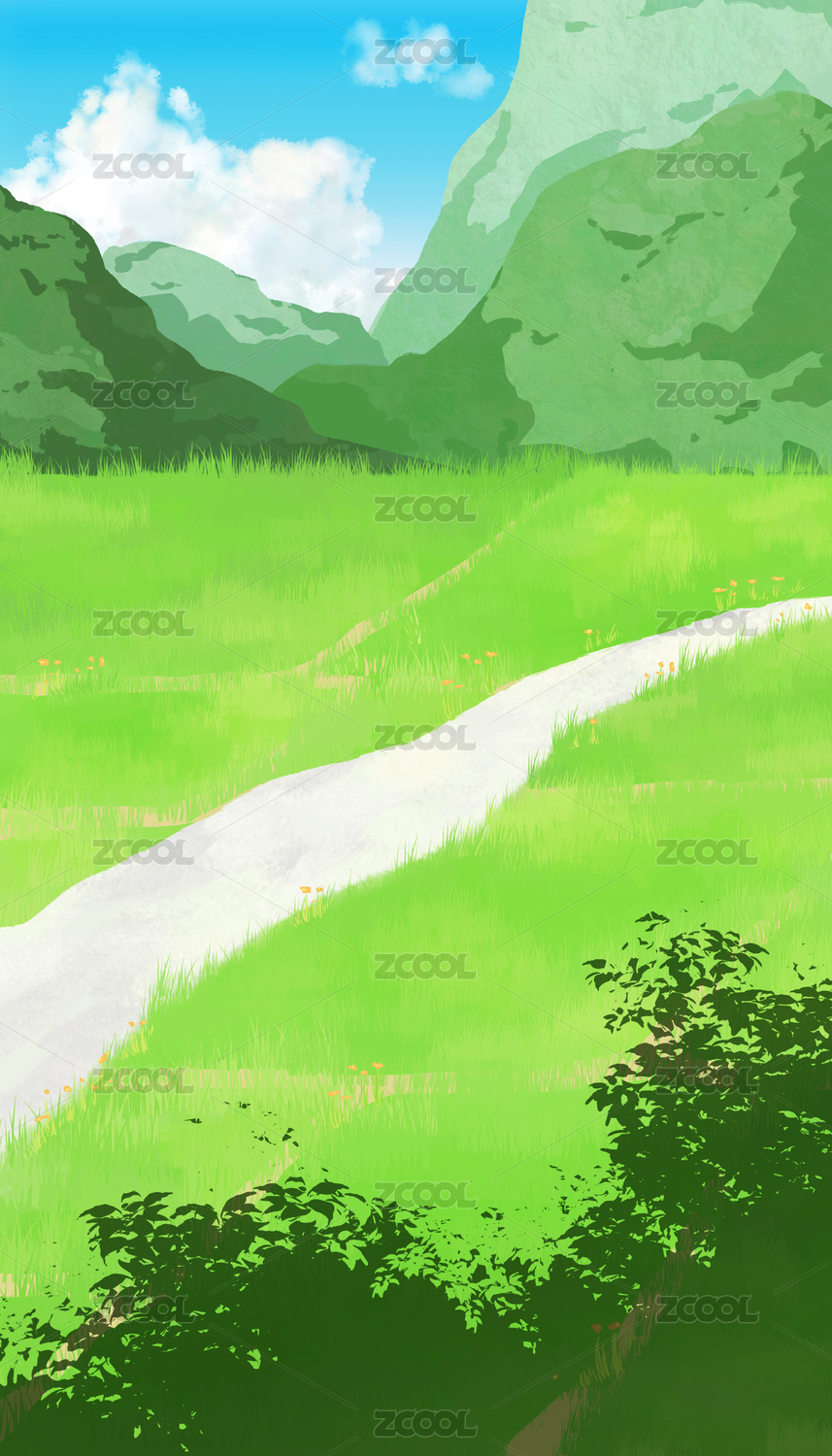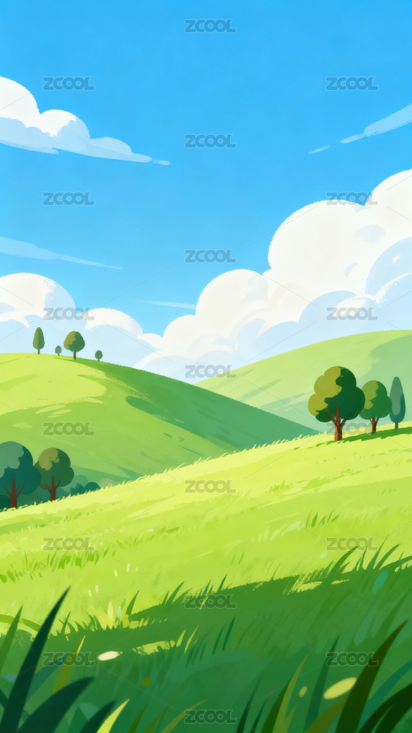 蓝天下的大草原与远处起伏的山脉唯美风景