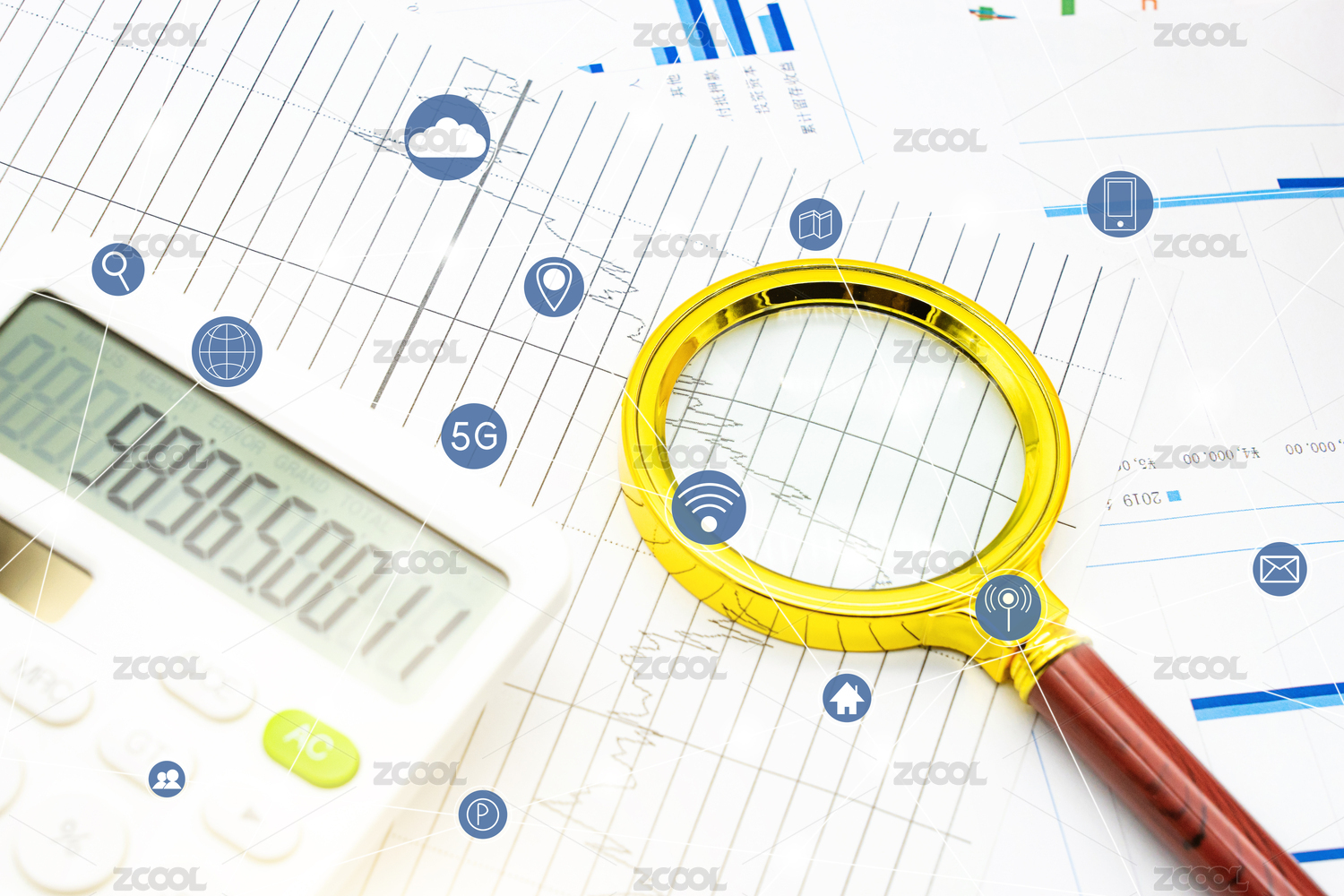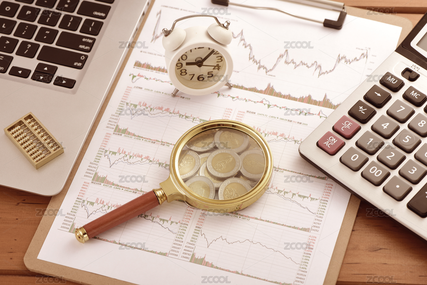 股市图表上放着笔记本电脑、放大镜、时钟等