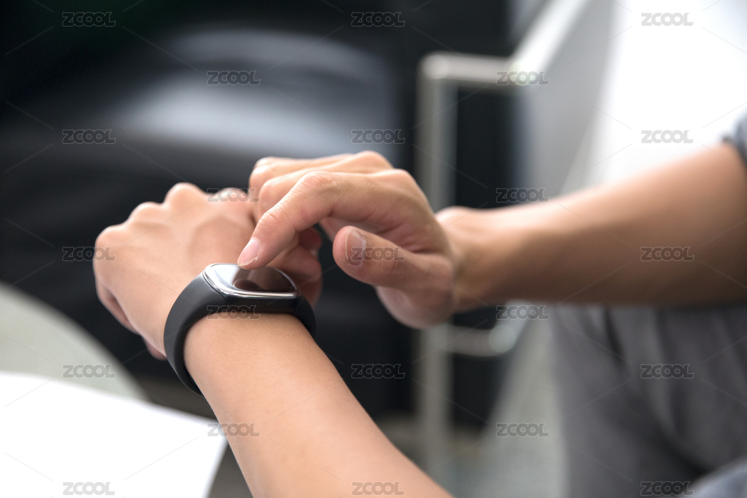 特写戴在胳膊上的商务手环另一只手在上面点击